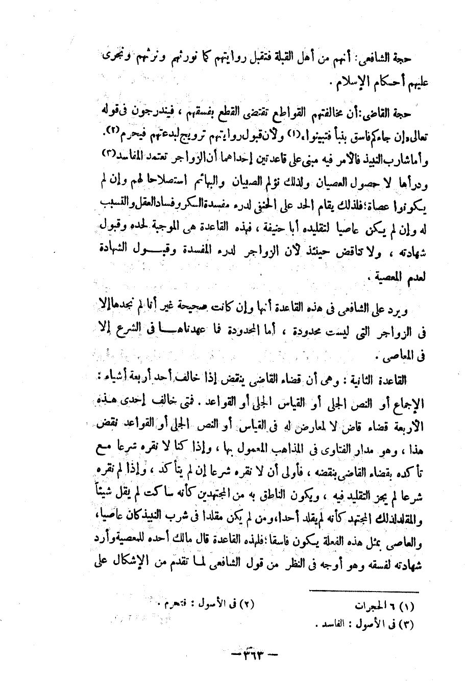 حجة القاضي: أن مخالفتهم القواطع تقتضي القطع بفسقهم، فيندرجون في قوله تعالى: «إن جاءكم فاسق بنبأ فتبينوا» (¬1) ولأن قبول روايتهم ترويج لبدعتهم فيحرم (¬2) . وأما شارب النبيذ فالأمر فيه مبني على قاعدتين إحداهما أن الزواجر تعتمد المفاسد (¬3) ودرأها لا حصول العصيان ولذلك نؤلم الصبيان والبهائم استصلاحاً لهم وإن لم يكونوا عصاة؛ فلذلك يقام الحد على الحنفي لدرء مفسدة السكر وفساد العقل والتسبب له وإن لم يكن عاصياً لتقليده أبا حنيفة، فهذه القاعدة هي الموجبة لحده وقبول شهادته، ولا تناقض حينئذ لأن الزواجر لدرء المفسدة وقبول الشهادة لعدم المعصية.