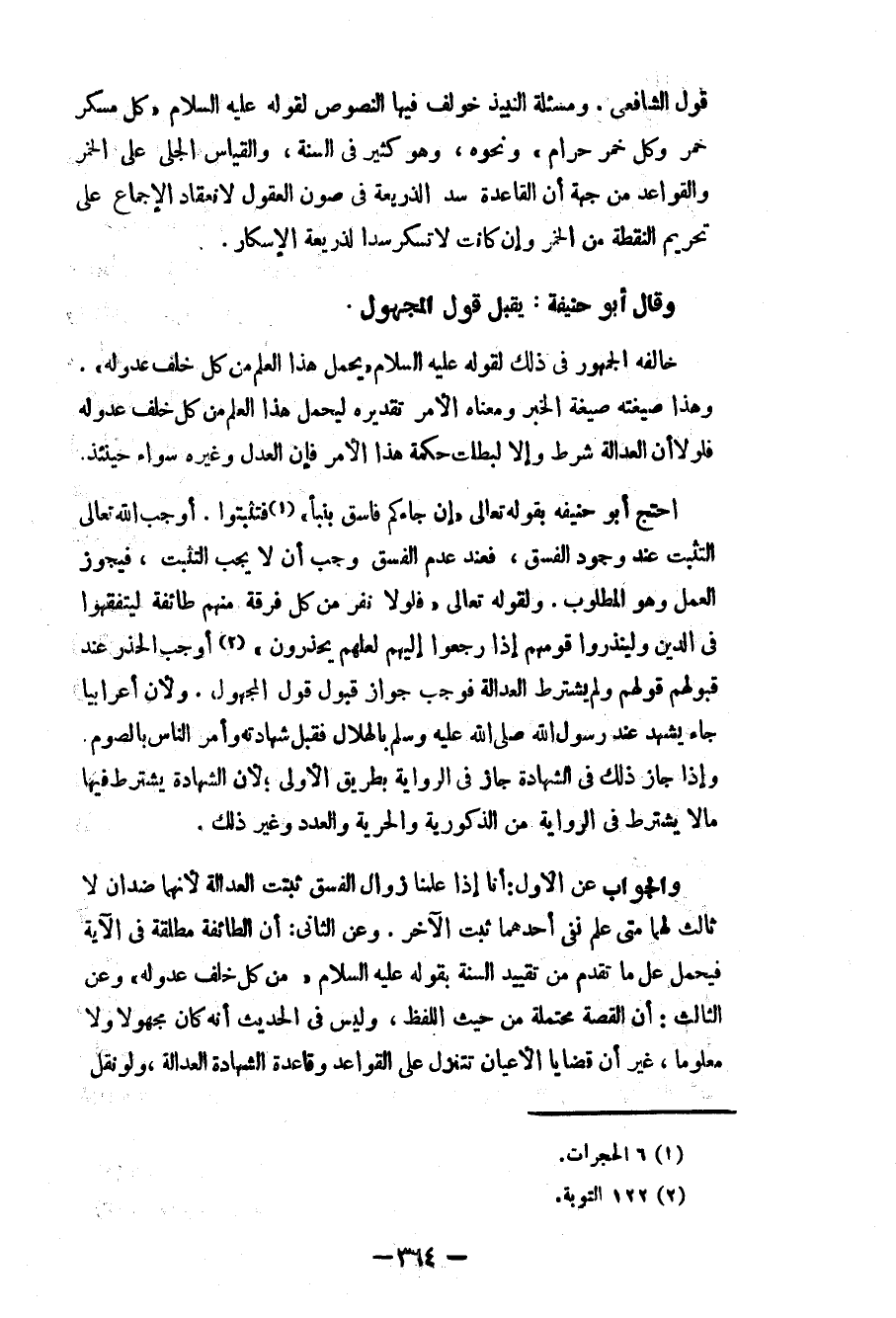 احتج أبو حنيفة بقوله تعالى: «إن جاءكم فاسق بنبأ» (¬1) فتبينوا. أوجب الله تعالى التثبت عند وجود الفسق، فعند عدم الفسق وجب أن لا يجب التثبت، فيجوز العمل وهو المطلوب. ولقوه تعالى: «فلولا نفر من كلّ فرقة منهم طائفة ليتفقهوا في الدين ولينذروا قومهم إذا رجعوا إليهم لعلهم يحذرون» (¬2) أوجب الحذر عند قبولهم قولهم ولم يشترط العدالة فوجب جواز قبول قول المجهول. ولأن أعرابياً جاء يشهد عند رسول الله - صلى الله عليه وسلم - بالهلال فقبل شهادته وأمر الناس بالصوم. وإذا جاز ذلك في الشهادة جاز في الرواية بطريق الأولى؛ لأن الشهادة يشترط فيها ما لا يشترط في الرواية من الذكورية والحرية والعدد وغير ذلك.