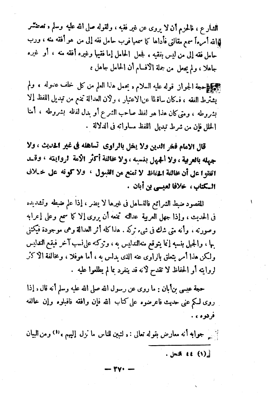 حجة عيسى بن أبان: ما روي عن رسولا لله - صلى الله عليه وسلم - أنه قال: «إذا روي لكم عني حديث فاعرضوه على كتبا الله فإن وافقه فاقبلوه وإن خالفه فردوه» .