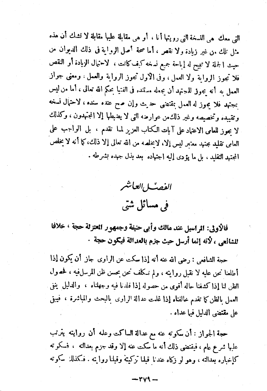 فالأولى: المراسيل عند مالك وأبي حنيفة وجمهور المعتزلة حجة، خلافاً للشافعي، لأنه إنّما أرسل حيث جزم بالعدالة فيكون حجة.