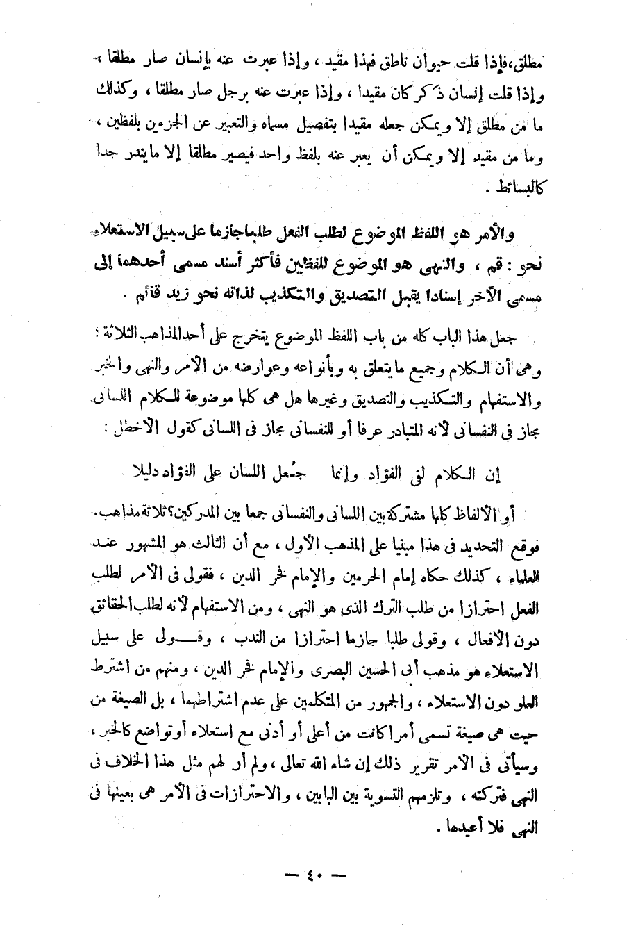 أو الألفاظ كلها مشتركة بين اللساني والنفساني جمعاً بين المدركين؟ ثلاثة مذاهب فوق التحديد في هذا مبنياً على المذهب الأول، مع أن الثالث هو المشهور عند العلماء، كذلك حكاه إمام الحرمين والإمام فخر الدين، فقولي فيا لأمر لطلب الفعل احترازاً من طلب الترك الذي هو النهي، ومن الاستفهام لأنه لطلب الحقائق دون الأفعال، وقولي طلباً جازماً احترازاً من الندب، وقولي على سبيل الاستعلاء هو مذهب أبي الحسين البصري والإمام فخر الدين، ومنهم من اشترط العلو دون الاستعلاء، والجمهور من المتكلمين على عدم اشتراطهما، بل الصيغة من حيث هي صيغة تسمى أمراً كانت من أعلى أو أدنى مع استعلاء أو تواضع كالخبر، وسيأتي في الأمر تقرير ذلك إن شاء الله تعالى، ولم أر لهم مثل هذا الخلاف في النهي فتركته، وتلزمهم التسوية بين البابين، والاحترازات في الأمر هي بعينها في النهي فلا أعيدها.