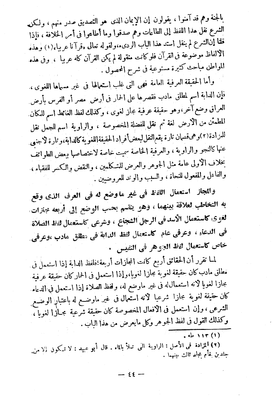 بالجنة وهم قد أمنوا، يقولون إن الإيمان الذي هو التصديق صدر منهم، ولكن الشرع نقل هذا اللفظ على الطاعات وهم صدقوا وما أطاعوا في أمر الخلافة، فإذا قلنا إن الشرع لم ينقل استد هذا الباب الرديء، ولقوله تعالى «قرآناً عربياً» (¬1) وهذه الألفاظ موضوعة في القرآن فلو كانت منقولة لم يكن القرآن كله عربياً، وفي هذه المواطن مباحث كثيرة مستوعبة في شرح المحصول.