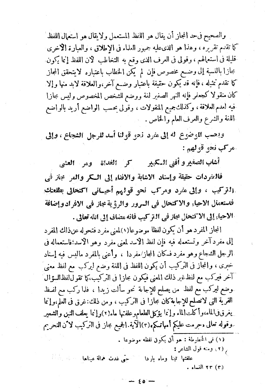 فالتفردات حقيقة وإسناد الإشابة والإفناء إلى الكر والمر مجاز في التركيب، وغلى مفرد ومركب نحو قولهم أحياني اكتحالي بطلعتك فاستعمال الإحياء والاكتحال في السرور والرؤية مجاز في الإفراد وإضافة الإحياء إلى الاكتحال مجاز في التركيب فإنه مضاف إلى الله تعالى.