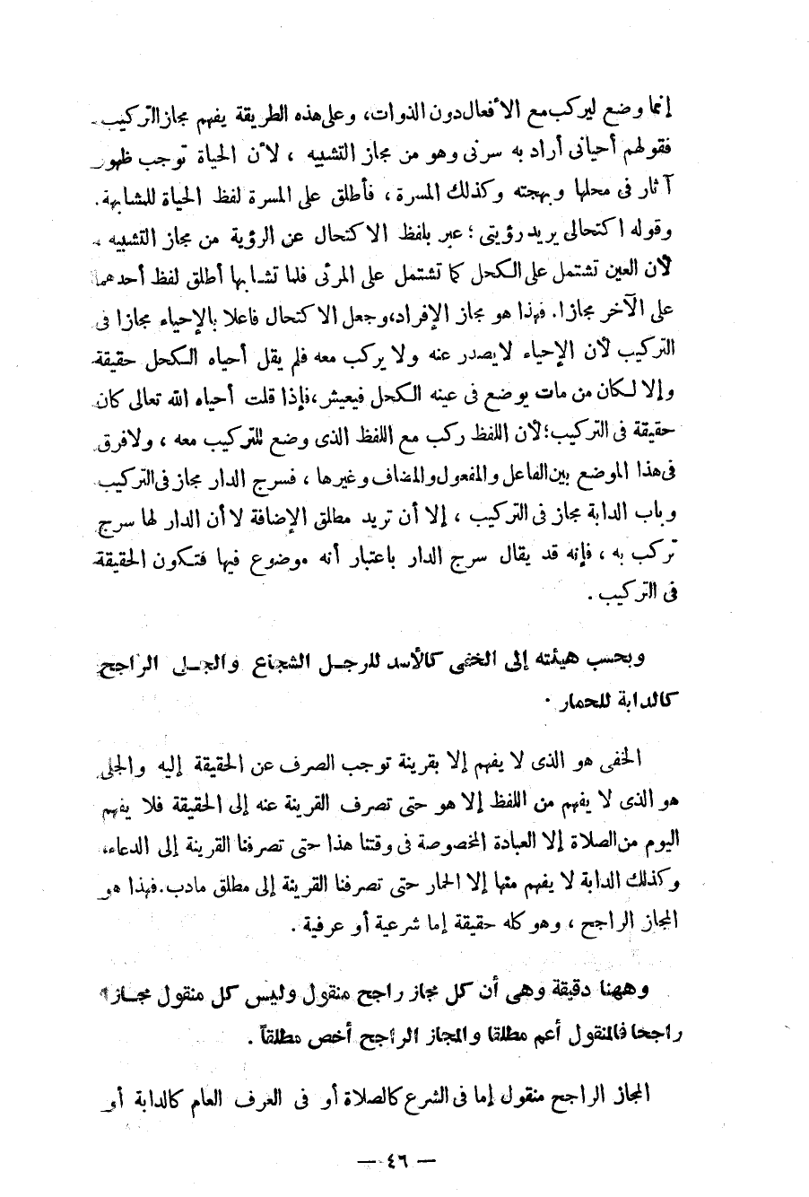 الخفي هو الذي لا يفهم إلا بقرينة توجب الصرف عن الحقيقة إليه والجلي هو الذي لا يفهم من اللفظ إلا هو حتى تصرف القرينة عنه إلى الحقيقة فلا يفهم اليوم من الصلاة إلا العبادة المخصوصة في وقتنا هذا حتى تصرفنا القرينة إلى الدعاء، وكذلك الدابة لا يفهم منها إلى الحمار حتى تصرفنا القرينة إلى مطلق ما دب. فهذا هو المجاز الراجح، وهو كله حقيقة إما شرعة أو عرفية.