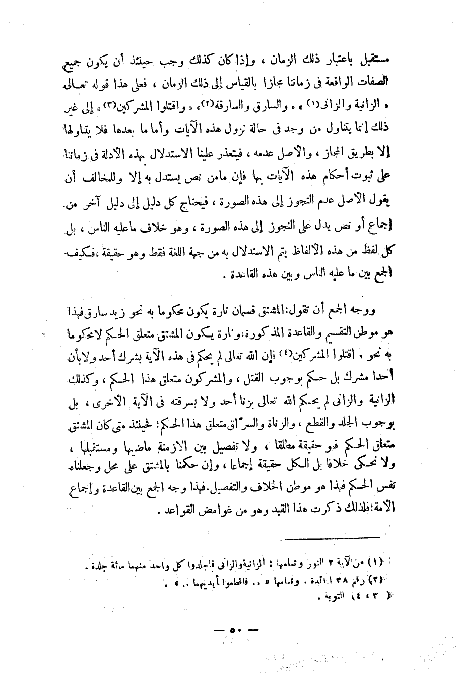 «الزانية والزاني (¬1) » «السارق والسارقة (¬2) » «واقتلوا المشركين (¬3) » إلى غير ذلك إنا يتناول من وجد في حالة نزول هذه الآيات وأما ما بعدها فلا يتناولها إلى بطريقة المجاز، والأصل عدمه، فيتعذر علينا الاستدلال بهذه الأدلة في زماننا على ثبوت أحكام هذه الآيات بها فإن ما من نص يستدل به غلا وللمخالف أن يقول الأصل عدم التجوز على هذه الصورة، فيحتاج كل دليل إلى دليل آخر من إجماع أو نص يدل على التجوز إلى هذه الصورة، وهو خلاف ما عليه الناس، بل كل لفظ من هذه الألفاظ يتم الاستدلال به من جهة اللغة فقط وهو حقيقة، فكيف الجمع بين ما عليه الناس وبين هذه القاعدة.