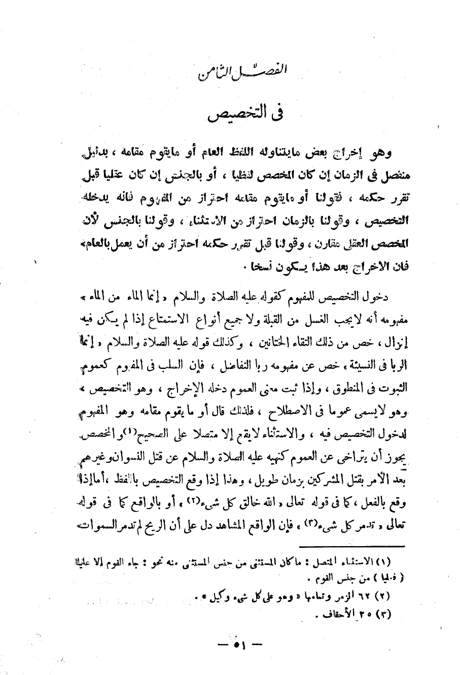 دخول التخصيص للمفهوم كقوله عليه الصلاة والسلام «إنما الماء من الماء» مفهومه أنه لا يجب الغسل من القبلة ولا جميع أنواع الاستمتاع إذا لم يكن فيه إنزال، خص من ذلك التقاء الختانين، وكذلك قوله عليه الصلاة والسلام «إنما الربا في النسيئة» خص عن مفهومه ربا التفاضل، فإن السلب في المفهوم كعموم الثبوت في المنطوق، وإذا ثبت معنى العموم دخله الإخراج، وهو التخصيص، وهو لا يسمى عموماً في الاصطلاح، فلذلك قال أو ما يقوم مقامه وهو المفهوم لدخول التخصيص فيه، والاستثناء لا يقع إلا متصلاً على الصحيح (¬1) والمخصص يجوز أن يتراخى عن العموم كنهيه عليه الصلاة والسلام عن قتل النسوان وغيرهم بعد الأمر بقتل المشركين بزمان طويل، وهذا إذا وقع التخصيص بالملفظ، أما إذا وقع بالفعل، كما في قوله تعالى «الله خالق كل شيء (¬2) » أو بالواقع كما في قوله تعالى «تدمر كل شيء (¬3) » فإن الواقع المشاهد دل على أن الريح لم تدمر السموات