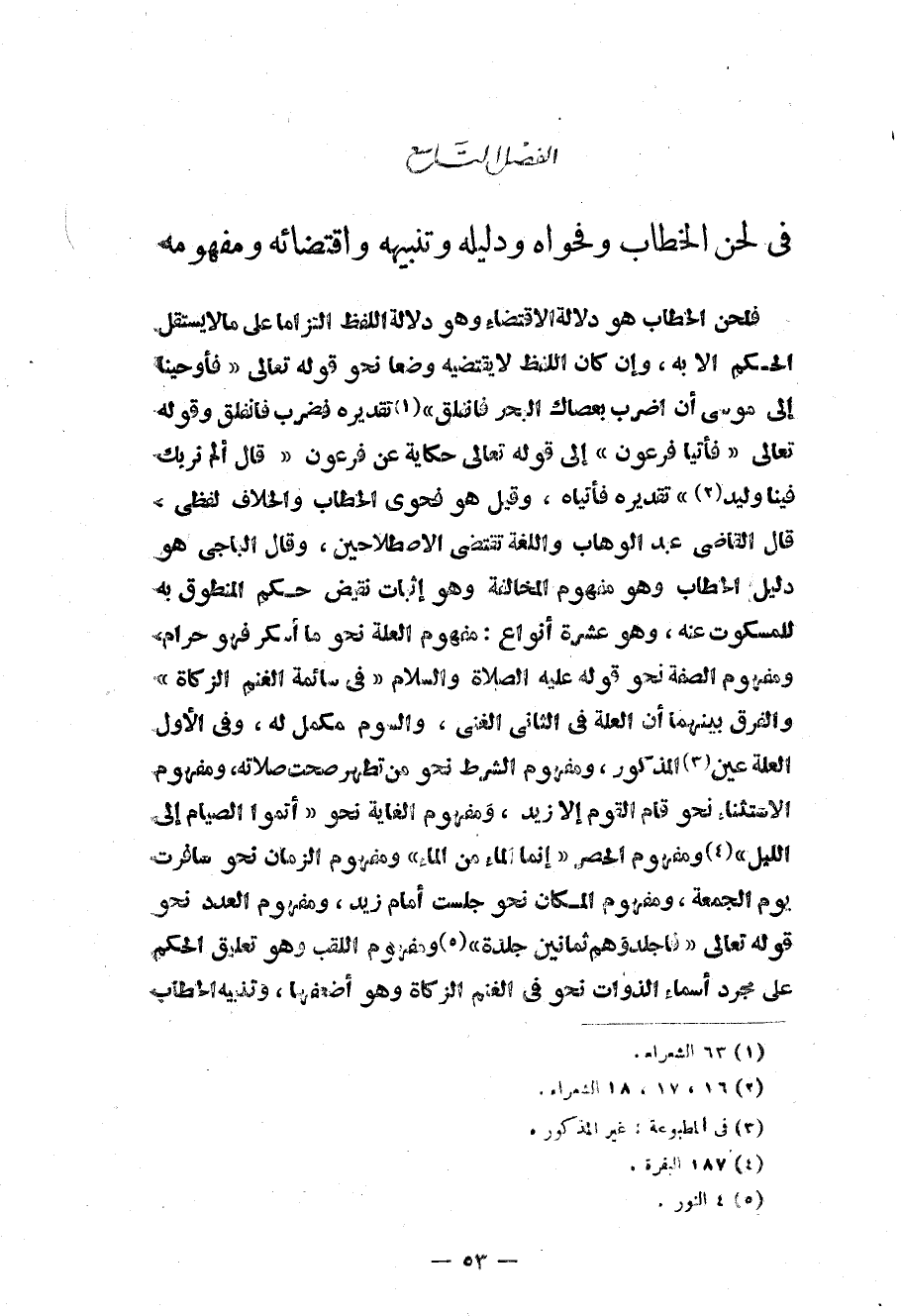 الفصل التاسع في لحن الخطاب وفحواه ودليله وتنبيهه واقتضائه ومفهومه