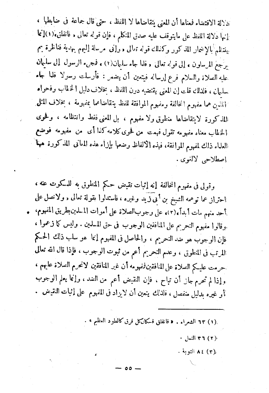 وقولي في مفهوم المخالفة إنه إثبات نقيض حكم المنطوق به للمسكوت عنه، احتراز عما توهمه الشيخ بن أبي زيد وغيره فاستدلوا بقوله تعالى «ولا تصل على أحد منهم مات أبداً» (¬3) على وجوب الصلاة على أموات المسلمين بطريق المفهوم، وقالوا مفهوم التحريم على المنافقين الوجوب في حق المسلمين. وليس كما زعموا، فإن الوجوب هو ضد التحريم، والحاصل في المفهوم إنما هو سلب ذلك الحكم المرتب في المنطوق، وعدم التحريم أعم من ثبوت الوجوب، فإذا قال الله تعالى حرمت عليكم الصلاة على المنافقين فمفهومه أن غير المنافقين لا تحرم الصلاة عليهم، وإذا لم تحرم جاز أن تباح، فإن النقيض أعم من الضد، وإنما يعلم الوجوب أو غيره بدليل منفصل، فلذلك يتعين أن لا يزاد في المفهوم على إثبات النقيض.