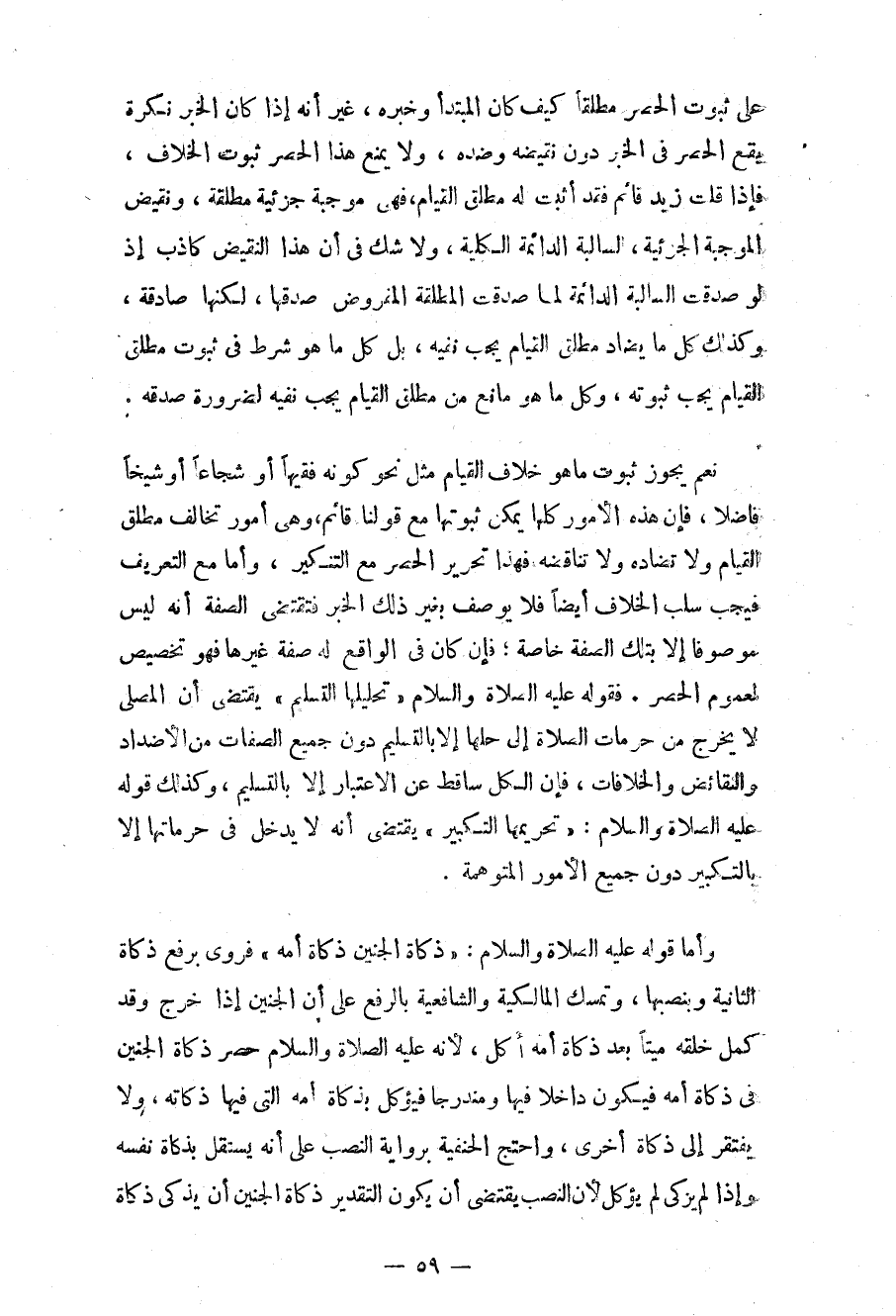 نعم يجوز ثبوت ما هو خلاف القيام مثل نحو كونه فقيهاً أو شجاعاً أو شيخاً فاضلاً، فإن هذه الأمور كلها يمكن ثبوتها مع قولنا قائم، وهي أمور تخالف مطلق القيام ولا تضاده ولا تناقضه، فهذا تحرير الحصر مع التنكير، وأما مع التعريف فيجب سلب الخلاف أيضاً فلا يوصف بغير ذلك الخبر فتقتضي الصفة أنه ليس موصوفاً إلا بتلك الصفة خاصة؛ فإن كان في الواقع له صفة غيرها فهو تخصيص لعموم الحصر. فقوله عليه الصلاة والسلام «تحليلها التسليم» يقتضي أن المصلي لا يخرج من حرمات الصلاة إلى حلها إلا بالتسليم دون جميع الصفات من الأضداد والنقائض والخلافات، فإن الكل ساقط عن الاعتبار إلا بالتسليم، وكذلك قوله عليه الصلاة والسلام: «تحريمها التكبير» يقتضي أنه لا يدخل في حرماتها إلا بالتكبير دون جميع الأمور المتوهمة.