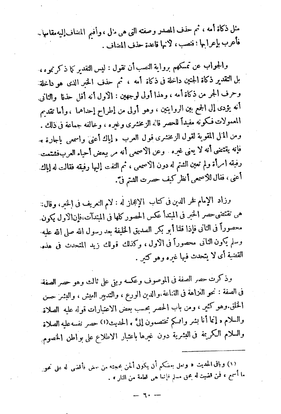 وزاد الإمام فخر الدين في كتاب الإعجاز له: لام التعريف في الخبر، وقال: هي تقتضي حصر الخبر في المبتدأ عكس الحصور كلها في المبتدآت، فإن الأول يكون محصوراً في الثاني فإذا قلنا أبو بكر الصديق الخليفة بعد رسول الله b يكون الثاني محصوراً في الأول، وكذلك قولك زيد المتحدث في هذه القضية أي لا يتحدث فيها غيره وهو كثير.