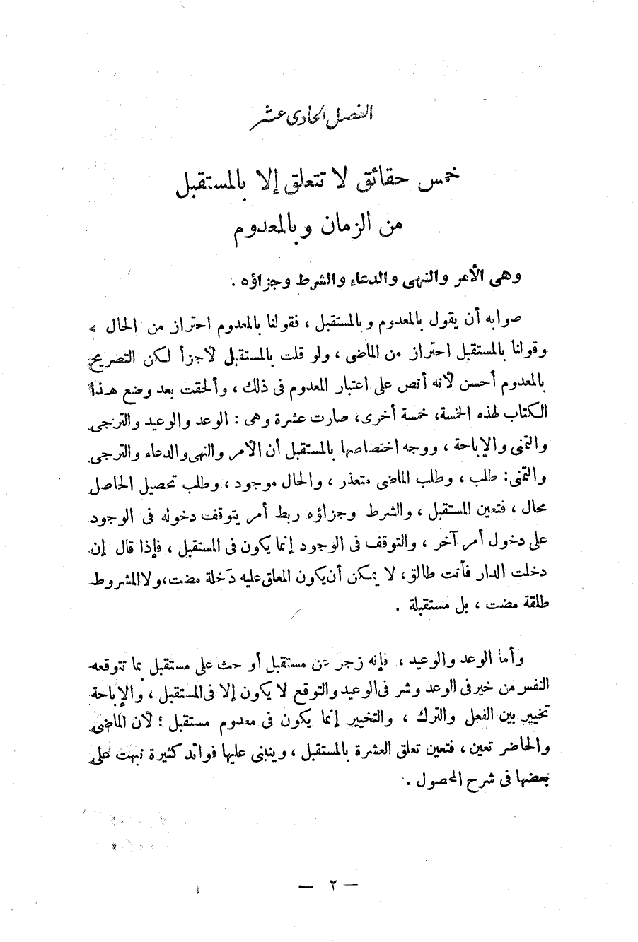 الفصل الحادي عشر خمس حقائق لا تتعلق إلا بالمستقبل من الزمان وبالمعدوم وهي الأمر والنهي والدعاء والشروط وجزاؤه.