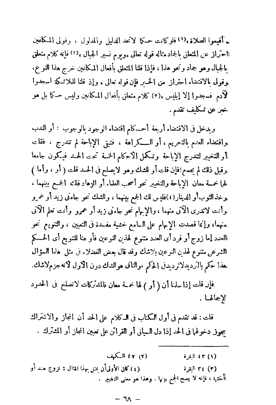 «أقيموا الصلاة» (¬1) فلو كانت حكماً لا تحد الدليل والمدلول، وقولي المكلفين احتراز عن المتعلق بالجماد مثاله قوله تعالى «ويوم نسير الجبال» (¬2) فإنه كلام متعلق بالجبال وهو جماد ونحو هذا، فإذا قلنا المتعلق بأفعال المكلفين خرج هذا النوع وقولي بالاقتضاء احتراز من الخبر فإن قوله تعالى «وإذا قلنا للملائكة اسجدوا لآدم فسجدوا إلا إبليس» (¬3) كلام متعلق بأفعال المكلفين وليس حكماً بل هو خبر عن تكليف تقدم.