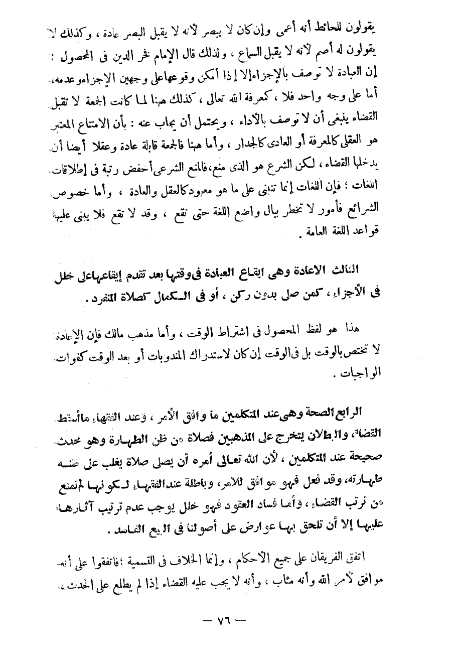 الرابع: الصحة وهي عند المتكلمين ما وافق الأمر، وعند الفقهاء ما أسقط القضاء، والبطلان يتخرج على المذهبين فصلاة من ظن الطهارة وهو محدث صحيحه عند المتكلمين، لأن الله تعالى أمره أن يصلي صلاة يغلب ظنه طهارته، وقد فعل فهو موافق للأمر، وباطله عند الفقهاء لكونها لم تمنع من ترتيب القضاء، وأما فساد العقود فهو خلل يوجب عدم ترتيب آثارها عليها إلا أن تلحق بها عوارض على أصولنا في البيع الفاسد.