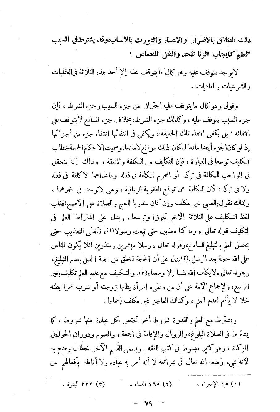 اشتراط العلم في التكليف قوله تعال «وما كنا معذبين حتى نبعث رسولاً (¬1) » نفي التعذي حتى يحصل العلم بالتبليغ للسامع، وقوله تعالى «رسلاً مبشرين ومنذرين لئلا يكون للناس على الله حجة بعد الرسل» (¬2) يدل على أن الحجة للخلق من جهة الجهل بعدم التبليغ، وبقوله تعالى «لا يكلف الله نفساً إلا وسعها» (¬3) ، والتكليف مع عدم العلم تكليف بغير الوسع، ولإجماع الأمة على أن من وطئ امرأة يظنها زوجته أو شرب خمراً يظنه خلاً لا يأثم لعدم العلم، وكذلك العاجز غير مكلف إجماعاً.