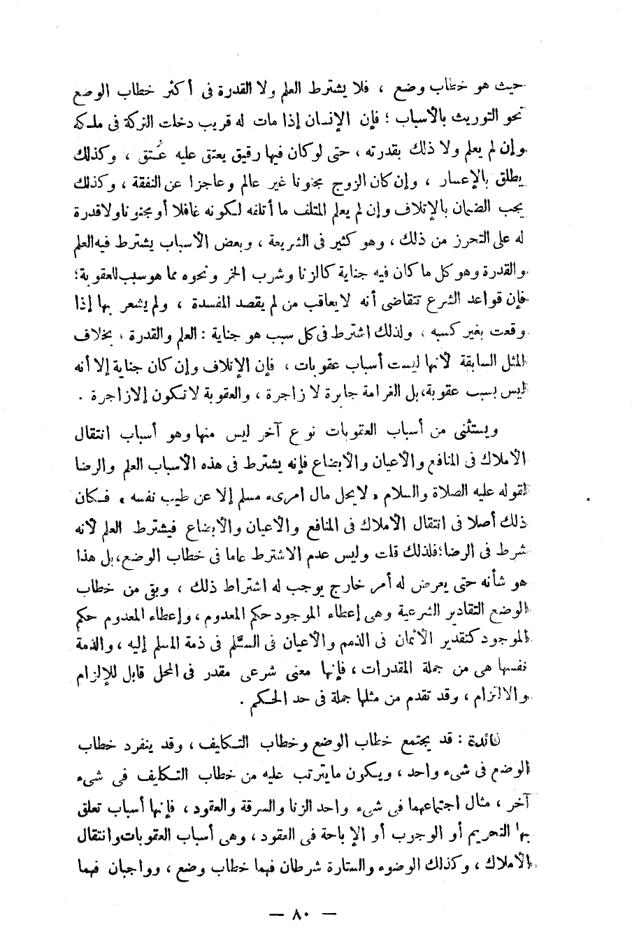 ويستثنى من أسباب العقوبات نوع آخر ليس منها وهو أسباب انتقال الأملاك في المنافع والأعيان والأبضاع فإنه يشترط في هذه الأسباب العلم والرضا لقوله عليه الصلاة والسلام «لا يحل مال امرئ مسلم إلا عن طيب نفس» فكان ذلك أصلاً في انتقال الأملاك والمنافع والأعيان والأبضاع فيشترط العلم لأنه شرط في الرضا؛ فلذلك قلت وليس عدم الاشتراط عاماً في خطاب الوضع، بل هذا هو شأنه حتى يعرض له أمر خارج يوجب له اشتراط ذلك، وبقي من خطاب الوضع التقادير الشرعية وهي إعطاء الموجود حكم المعدوم، وإعطاء المعدوم حكم الموجود كتقدير الأثمان في الذمم والأعيان في السَّلم في ذمة المسلم إليه، والذمة نفسها هي من جملة المقدرات، فإنها معنى شرعي مقدر في المحل قابل للإلزام والإلزام، وقد تقدم من مثلها جملة في حد الحكم.