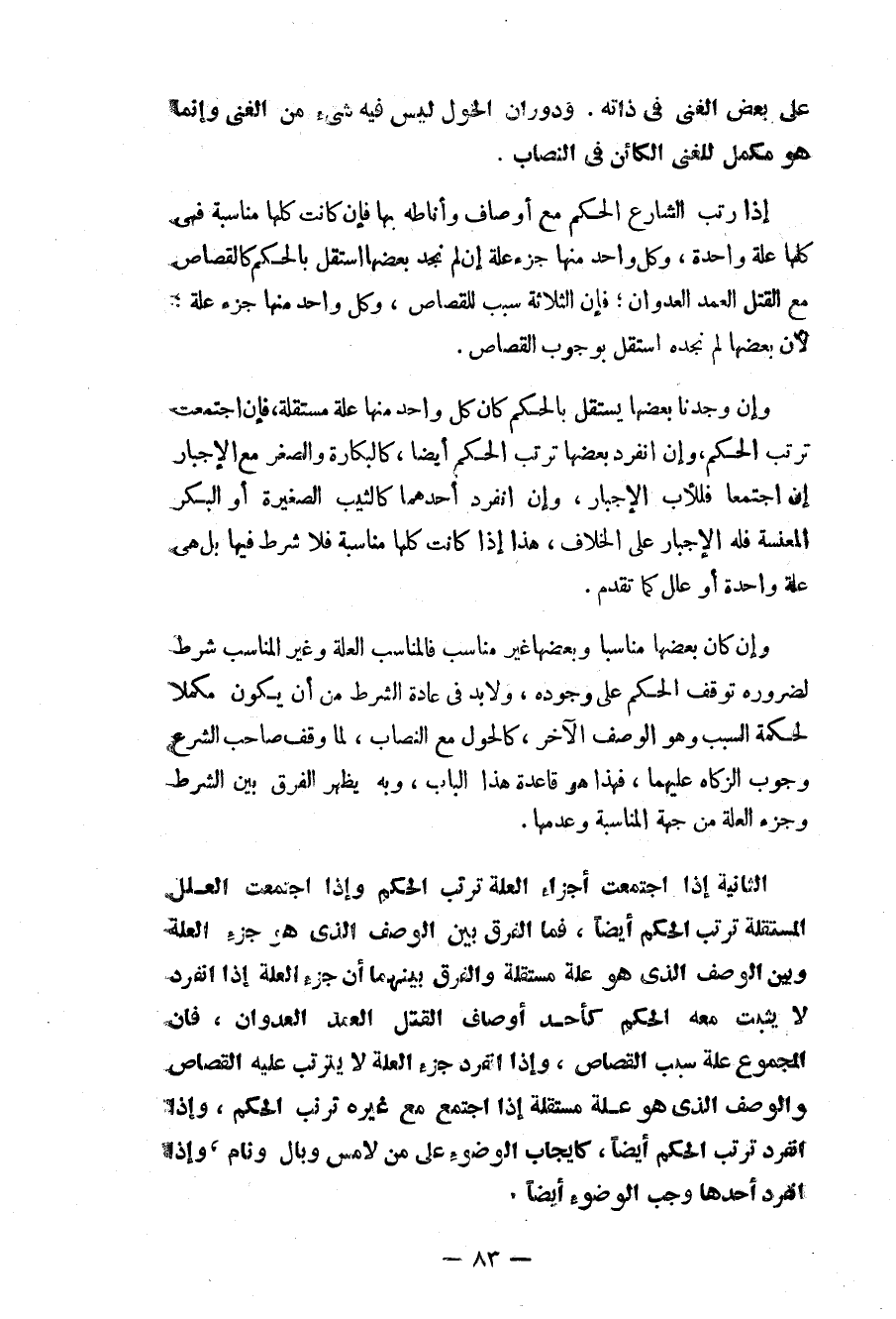 الثانية إذا اجتمعت أجزاء العلة ترتب الحكم وإذا اجتمعت العلل المستقلة ترتب الحكم أيضاً، فما الفرق بين الوصف الذي هو جزء العلة وبين الوصف الذي هو علة مستقلة والفرق بينهما أن جزء العلة إذا انفرد لا يثبت معه الحكم كأحد أوصاف القتل العمد العدوان، فإن المجموع علة سبب القصاص، وإذا انفرد جزء العلة لا يترتب عليه القصاص والوصف الذي هو علة مستقلة إذا اجتمع مع غيره ترتب الحكم، وإذا انفرد ترتب الحكم أيضاً، كإيجاب الوضوء على من لامس وبال ونام، وإذا انفرد أحدها وجب الوضوء أيضاً.