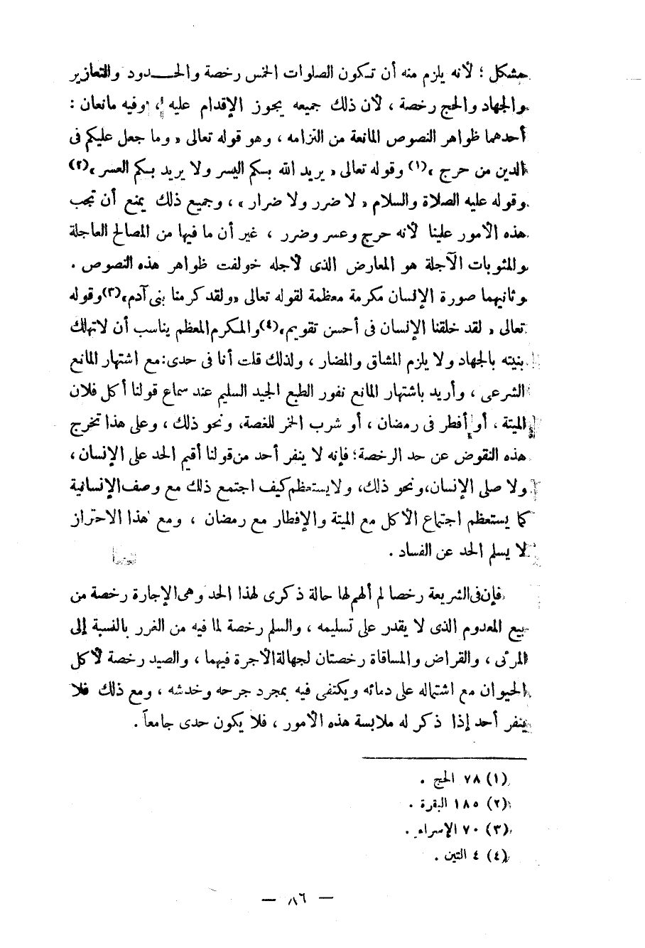 التزامه، وهو قوله تعالى «وما جعل الله عليكم في الدين من حرج» (¬1) ، وقوله تعالى «يريد الله بكم اليسر ولا يريد بكم العسر» (¬2) ، وقوله عليه الصلاة والسلام «لا ضرر ولا ضرار» ، وجميع ذلك يمنع أن تجب هذه الأمور علينا لأنه حرج وعسر وضرر، غير أن ما فيها من المصالح العاجلة والمثوبات الآجلة هو المعارض الذي لأجله خولفت ظواهر هذه النصوص. وثانيهما صورة الإنسان مكرمة معظمة لقوله تعالى «ولقد كرمنا بني آدم» (¬3) ، وقوله تعالى «لقد خلقنا الإنسان في أحسن تقويم» (¬4) ، والمكرم المعظم يناسب أن لا تهلك بنيته بالجهاد ولا يلزم المشاق والمضار، ولذلك قلت أنا في حدي: مع اشتهار المانع اشرعي، وأريد باشتهار المانع نفور الطبع الجيد السليم عند سماع قولنا أكل فلان الميتة، أو أفطر في رمضان، أو شرب الخمر للغصة، ونحو ذلك، وعلى هذا تخرج هذه النقوض عن حد الرخصة؛ فإنه لا ينفر أحد من قولنا أقيم الحد على الإنسان، ولا صلى الإنسان، ونحو ذلك، ولا يستعظم كيف اجتمع ذلك مع وصف الإنسانية كما يستعظم اجتماع الأكل مع الميتة والإفطار مع رمضان، ومع هذا الاحتراز لا يسلم الحد عن الفساد.