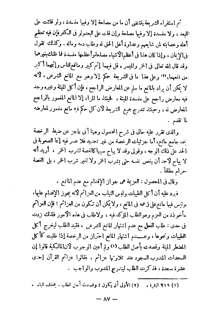 ثم استقراء الشريعة يقتضي أن ما من مصلحة إلا وفيها مفسدة، ولو قلَّت على البعد، ولا مفسدة إلا وفيها مصلحة وإن قلت على البعد ولو في الكفر فإن فيه تعظيم أهله وعصابته لمن شايعهم وعداوة أهل الحق له وطلب دمه وماله. وكذلك تقول في الإيمان، وإذا كان هذا في أعظم الأشياء مصلحة وأعظمها مفسدة فما ظنك بغيرهما، وقد قال الله تعالى في الخمر والميسر «قل فيهما إثم كبير ومنافع للناس وإثمهما أكبر من نفعهما» (¬1) ، وعلى هذا ما في الشريعة حكم إلا وهو مع المانع الشرعي، لأنه لا يمكن أن يراد بالمانع ما سلم عن المعارض الراجح، فإن أكل الميتة وغيره وجد فيه معارض راجح على مفسدة الميتة، فحينئذ ما المراد إلا المانع المغمور بالراجح المعارض له، وحينئذ تندرج جميع الشريعة لأن كل حكم فيه مانع مغمور لمعارضته لما تقدم.