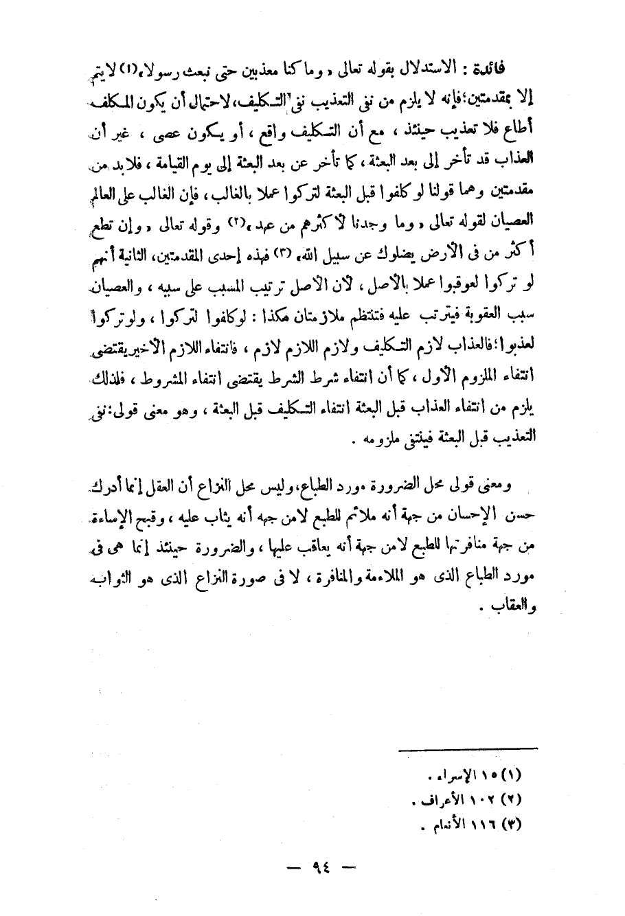 كلفوا قبل البعثة لتركوا عملاً بالغالب، فإن الغالب على العالم العصيان لقوله تعالى «وما وجدنا لأكثرهم من عهد» (¬2) وقوله تعالى «وإن تطع أكثر من في الأرض يضلوك عن سبيل الله» (¬3) فهذه إحدى المقدمتين، الثانية أنهم لو تركوا لعوقبوا عملاً بالأصل، لأن الأصل ترتيب المسبب على سببه، والعصيان سبب العقوبة فيترتب عليه فتنتظم ملازمتان هكذا: لو كلفوا لتركوا، ولو تركوا لعذبوا؛ فالعذاب لازم التكليف ولازم اللازم لازم، فانتفاء اللازم الأخير يقتضي انتفاء الملزوم الأول، كما أن انتفاء شرط الشرط يقتضي انتفاء المشروط، فلذلك يلزم من انتفاء العذاب قبل البعثة انتفاء التكليف قبل البعثة، وهو معنى قولي: نفي التعذيب قبل البعثة فينتفي ملزومه.