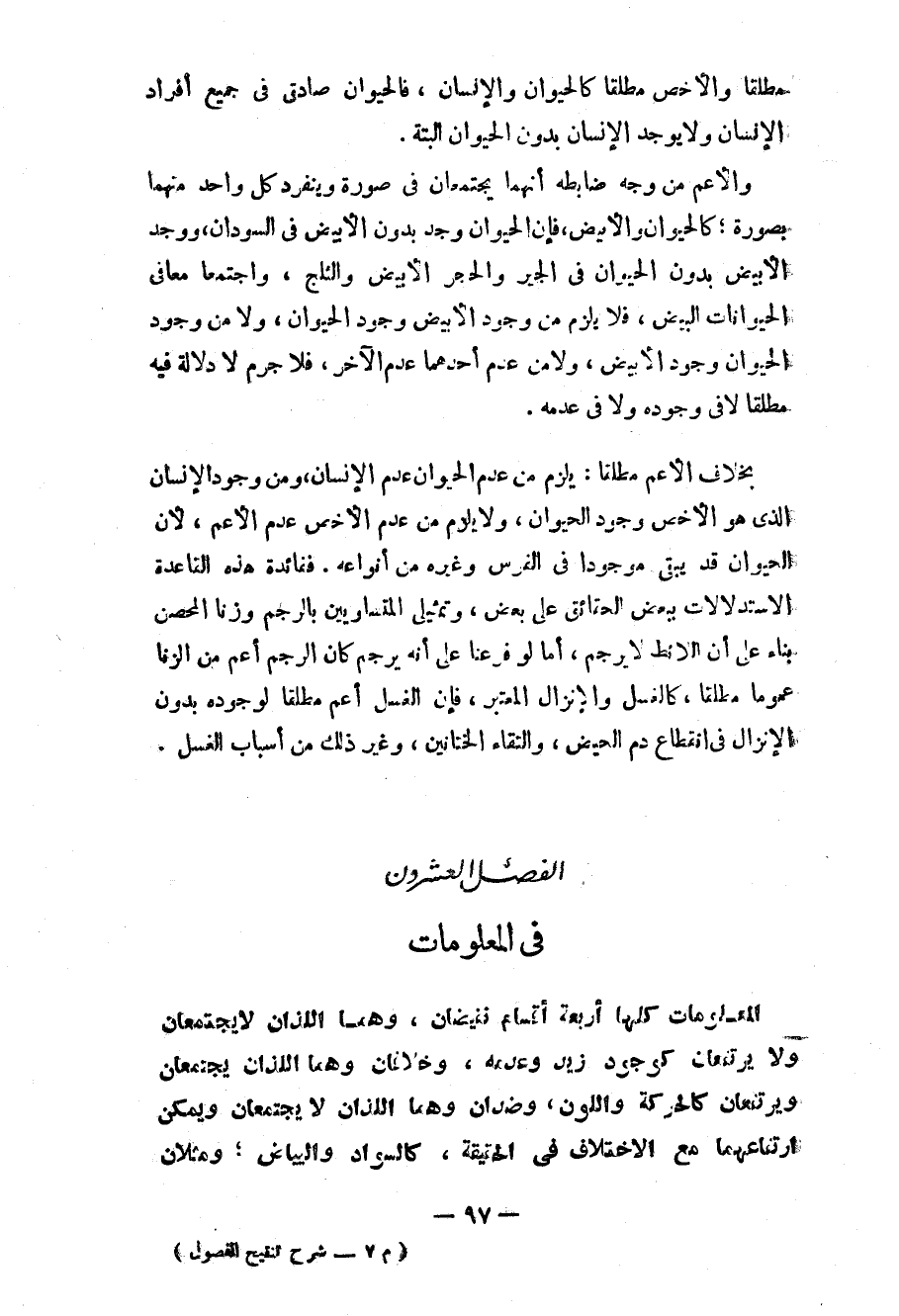 بخلاف الأعم مطلقاً: يلزم من عدم الحيوان أن عدم الإنسان، ومن وجود الإنسان الذي هو الأخص وجود الحيوان، ولا يلزم من عدم الأخص عدم الأعم، لأن الحيوان قد يبقى موجوداً في الفرس وغيره من أنواعه. ففائدة هذه القاعدة الاستدلالات ببعض الحقائق على بعض، وتمثيلي المتساويين بالرجم وزناً المحسن بناءً على أن اللائط لا يرجم، أما لو فرعنا على أه يرجم كان الرجم أعم من الزنا عموماً مطلقاً، كالغسل والإنزال المعتبر، فإن الغسل أعم مطلقاص لوجوده بدون الإنزال في انقطاع دم الحيض، والتقاء الختانين، وعدم ذلك من أسباب الغسل.