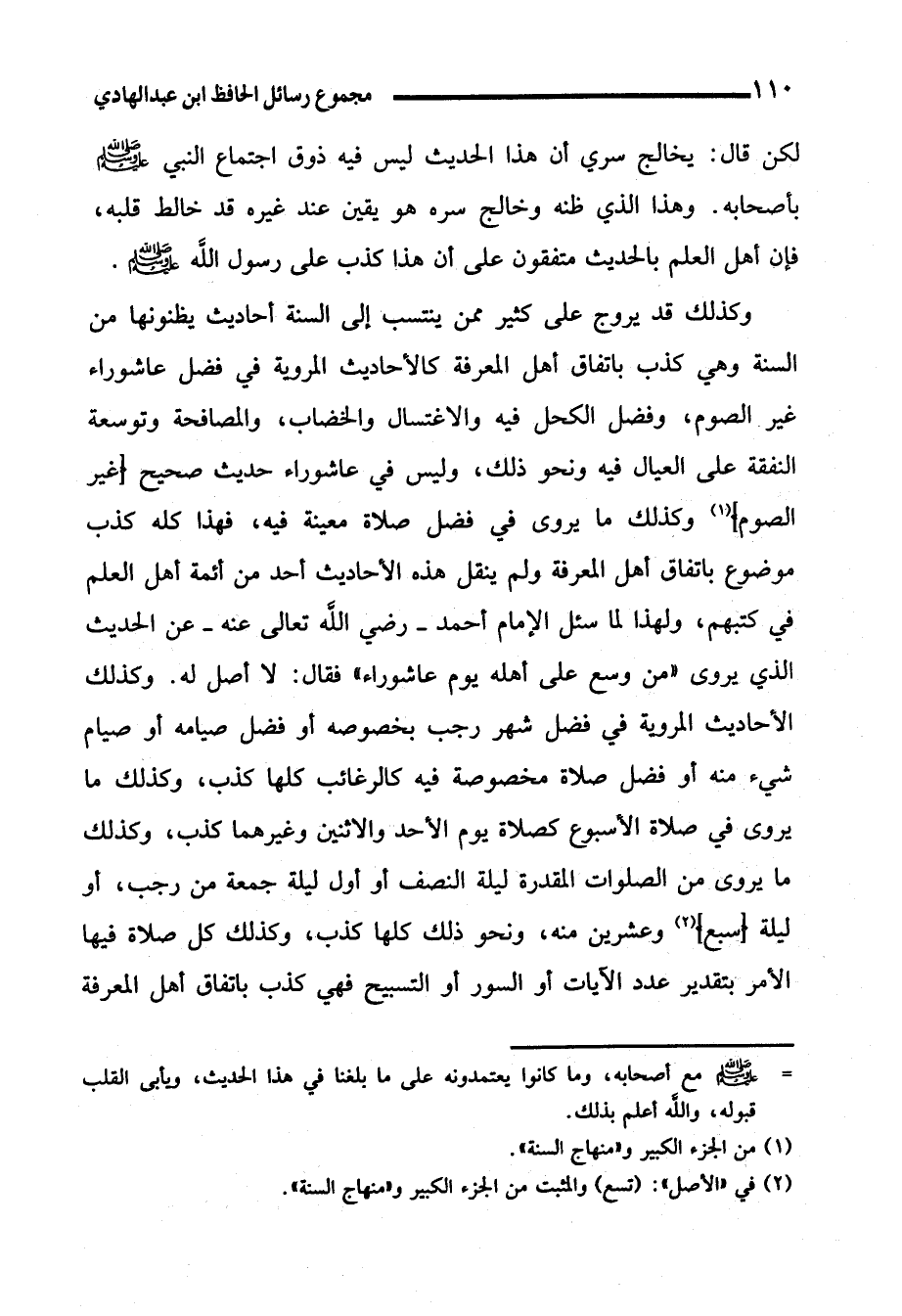 وكذلك قد يروج على كثير ممن ينتسب إلى السنة أحاديث يظنونها من السنة وهي كذب باتفاق أهل المعرفة كالأحاديث المروية في فضل عاشوراء غير الصوم، وفضل الكحل فيه والاغتسال والخضاب، والمصافحة وتوسعة النفقة على العيال فيه ونحو ذلك، وليس في عاشوراء حديث صحيح {غير الصوم} (¬1) وكذلك ما يروى في فضل صلاة معينة فيه، فهذا كله كذب موضوع باتفاق أهل المعرفة ولم ينقل هذه الأحاديث أحد من أئمة أهل العلم في كتبهم، ولهذا لما سئل الإمام أحمد - رضي الله تعالى عنه - عن الحديث الذي يروى "من وسع على أهله يوم عاشوراء" فقال: لا أصل له. وكذلك الأحاديث المروية في فضل شهر رجب بخصوصه أو فضل صيامه أو صيام شيء منه أو فضل صلاة مخصوصة فيه كالرغائب كلها كذب، وكذلك ما يروى في صلاة الأسبوع كصلاة يوم الأحد والاثنين وغيرهما كذب، وكذلك ما يروى من الصلوات المقدرة ليلة النصف أو أول ليلة جمعة من رجب، أو ليلة {سبع} (¬2) وعشرين منه، ونحو ذلك كلها كذب، وكذلك كل صلاة فيها الأمر بتقدير عدد الآيات أو السور أو التسبيح فهي كذب باتفاق أهل المعرفة