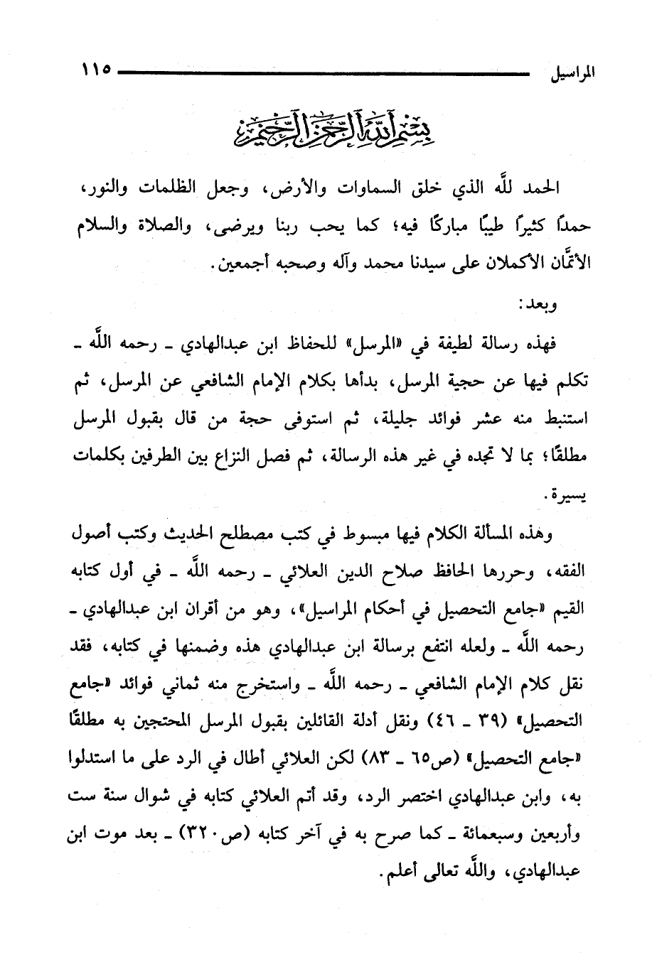 وهذه المسألة الكلام فيها مبسوط في كتب مصطلح الحديث وكتب أصول الفقه، وحررها الحافظ صلاح الدين العلائي -رحمه الله- في أول كتاب القيم "جامع التحصيل في أحكام المراسيل"، وهو من أقران ابن عبد الهادي - رحمه الله- ولعله انتفع برسالة ابن عبد الهادي هذه وضمنها في كتابه، فقد نقل كلام الإمام الشافعي -رحمه الله- واستخرج منه ثماني فوائد "جامع التحصيل" (39 - 46) ونقل أدلة القائلين بقبول المرسل المحتجين به مطلقًا "جامع التحصيل" (ص 65 - 83) لكن العلائي أطال في الرد على ما استدلوا به، وابن عبد الهادي اختصر الرد، وقد أتم العلائي كتابه في شوال سنة ست وأربعين وسبعمائة -كما صرح به في آخر كتابه (ص 320) - بعد موت ابن عبد الهادي، والله تعالى أعلم.