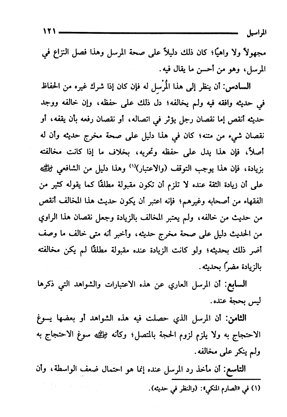 السادس: أن ينظر إلى هذا المُرسِل له فإن كان إذا شرك غيره من الحفاظ في حديثه وافقه فيه ولم يخالفه؛ دل ذلك على حفظه، وإن خالفه ووجد حديثه أنقص إما نقصان رجل يؤثر في اتصاله، أو نقصان رفعه بأن يقفه، أو نقصان شيء من متنه؛ كان في هذا دليل على صحة مخرج حديثه وأن له أصلًا، فإن هذا يدل على حفظه وتحريه، بخلاف ما إذا كانت مخالفته بزيادة، فإن هذا يوجب التوقف (والاعتبار) (¬1) وهذأ دليل من الشافعي - رضي الله عنه - على أن زيادة الثقة عنده لا تلزم أن تكون مقبولة مطلقًا كما يقوله كثير من الفقهاء من أصحابه وغيرهم؛ فإنه اعتبر أن يكون حديث هذا المخالف أنقص من حديث من خالفه، ولم يعتبر المخالف بالزيادة وجعل نقصان هذا الراوي من الحديث دليل على صحة مخرج حديثه، وأخبر أنه متى خالف ما وصف أضر ذلك بحديثه؛ ولو كانت الزيادة. عنده مقبولة مطلقًا لم يكن مخالفته بالزيادة مضرًا بحديثه.