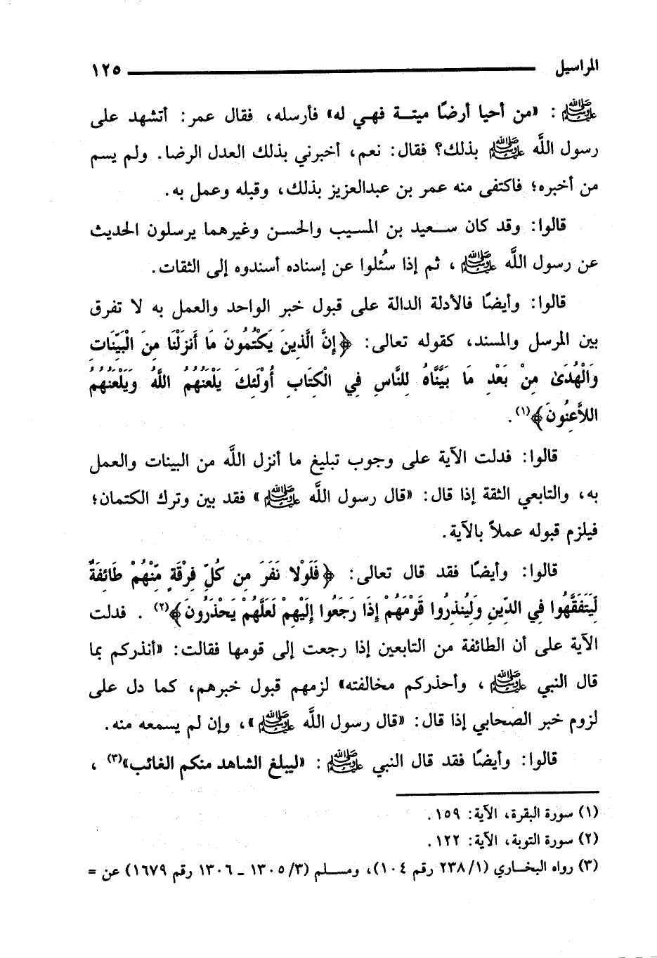 قالوا: وأيضًا فالأدلة الدالة على قبول خبر الواحد والعمل به لا تفرق بين المرسل والمسند، كقوله تعالى: {إِنَّ الَّذِينَ يَكْتُمُونَ مَا أَنْزَلْنَا مِنَ الْبَيِّنَاتِ وَالْهُدَى مِنْ بَعْدِ مَا بَيَّنَّاهُ لِلنَّاسِ فِي الْكِتَابِ أُولَئِكَ يَلْعَنُهُمُ اللَّهُ وَيَلْعَنُهُمُ اللَّاعِنُونَ} (¬1).