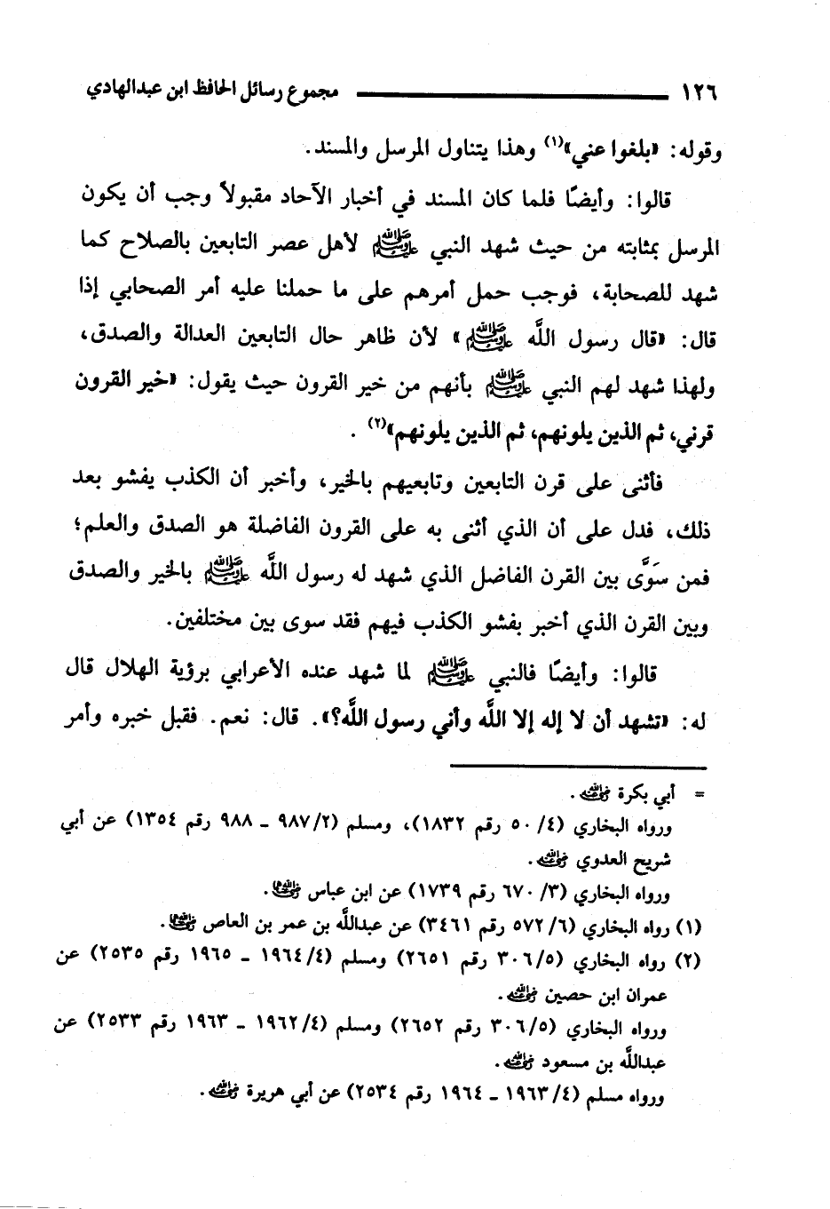 فأثنى على قرن التابعين وتابعيهم بالخير، وأخبر أن الكذب يفشو بعد ذلك، فدل على أن الذي أثنى به على القرون الفاضلة هو الصدق والعلم؛ فمن سَوَّى بين القرن الفاضل الذي شهد له رسول الله - صلى الله عليه وسلم - بالخير والصدق وبين القرن الذي أخبر بفشو الكذب فيهم فقد سوى بين مختلفين.