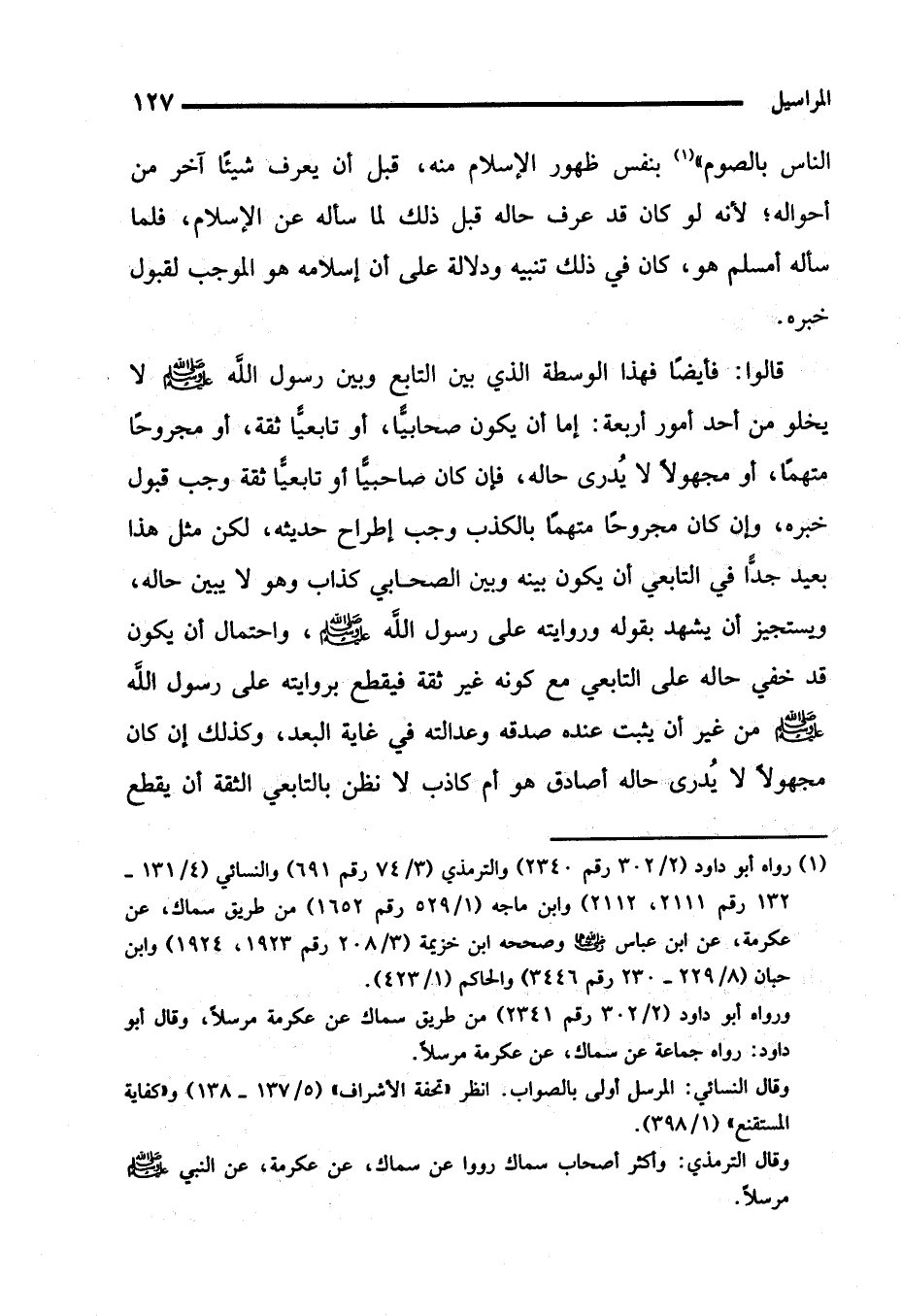 (¬1) رواه أبو داود (2/ 302 رقم 2340) والترمذي (3/ 74 رقم 691) والنسائي (4/ 131 - 132 رقم 2111، 2112) وابن ماجه (1/ 529 رقم 1652) من طريق سماك، عن عكرمة، عن ابن عباس - رضي الله عنهما - وصححه ابن خزيمة (3/ 208 رقم 1923، 1924) وابن حبان (8/ 229 - 230 رقم 3446) والحاكم (1/ 423).