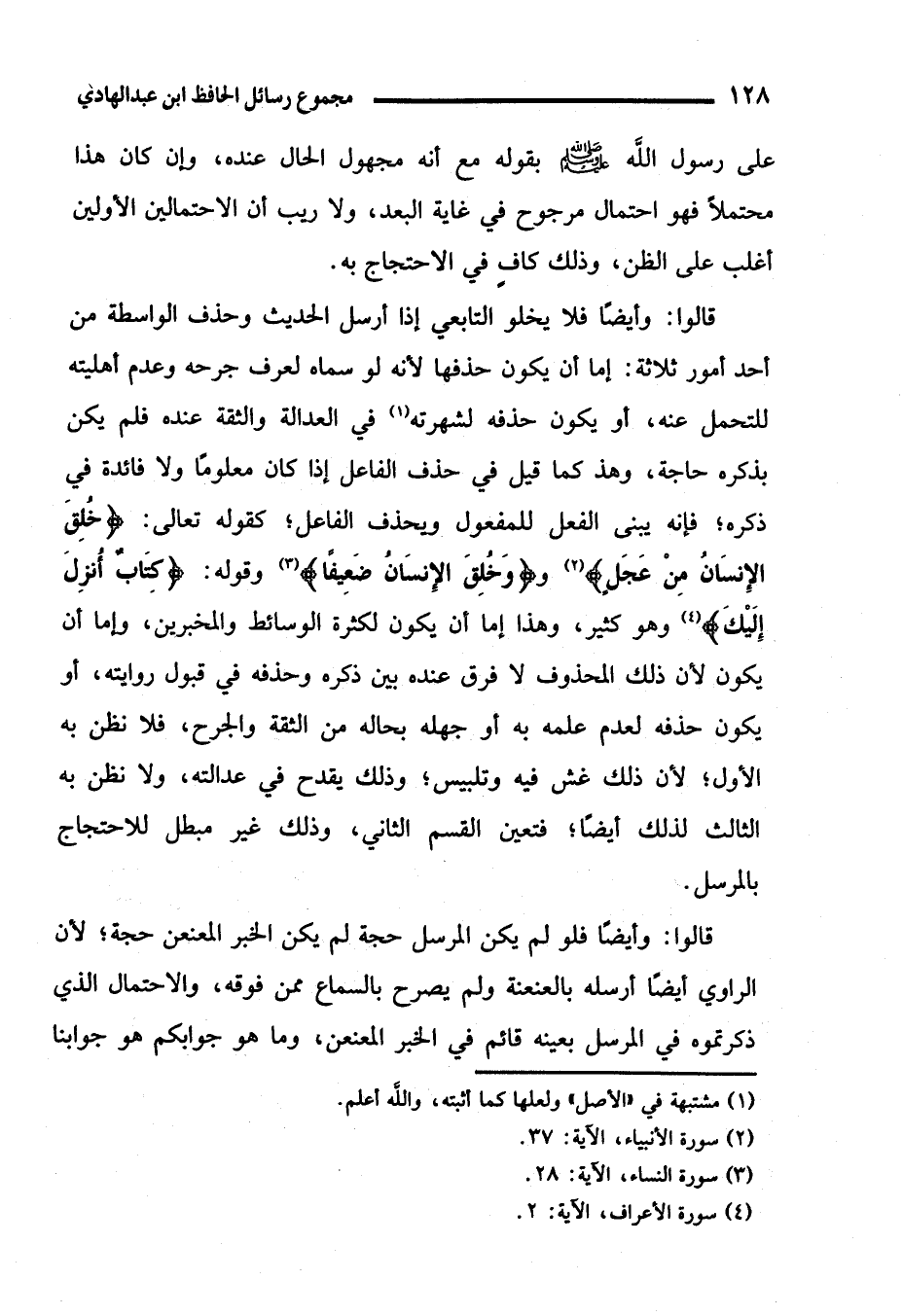قالوا: وأيضًا فلا يخلو التابعي إذا أرسل الحديث وحذف الواسطة من أحد أمور ثلاثة: إما أن يكون حذفها لأنه لو سماه لعرف جرحه وعدم أهليته للتحمل عنه، أو يكون حذفه لشهرته (¬1) في العدالة والثقة عنده فلم يكن بذكره حاجة، وهذ كما قيل في حذف الفاعل إذا كان معلومًا ولا فائدة في ذكره؛ فإنه يبنى الفعل للمفعول ويحذف الفاعل؛ كقوله تعالى: {خُلِقَ الْإِنْسَانُ مِنْ عَجَلٍ} (¬2) و {وَخُلِقَ الْإِنْسَانُ ضَعِيفًا} (¬3) وقوله: {كِتَابٌ أُنْزِلَ إِلَيْكَ} (¬4) وهو كثير، وهذا إما أن يكون لكثرة الوسائط والمخبرين، وإما أن يكون لأن ذلك المحذوف لا فرق عنده بين ذكره وحذفه في قبول روايته، أو يكون حذفه لعدم علمه به أو جهله بحاله من الثقة والجرح، فلا نظن به الأول؛ لأن ذلك غش فيه وتلبيس؛ وذلك يقدح في عدالته، ولا نظن به الثالث لذلك أيضًا؛ فتعين القسم الثاني، وذلك غير مبطل للاحتجاج بالمرسل.