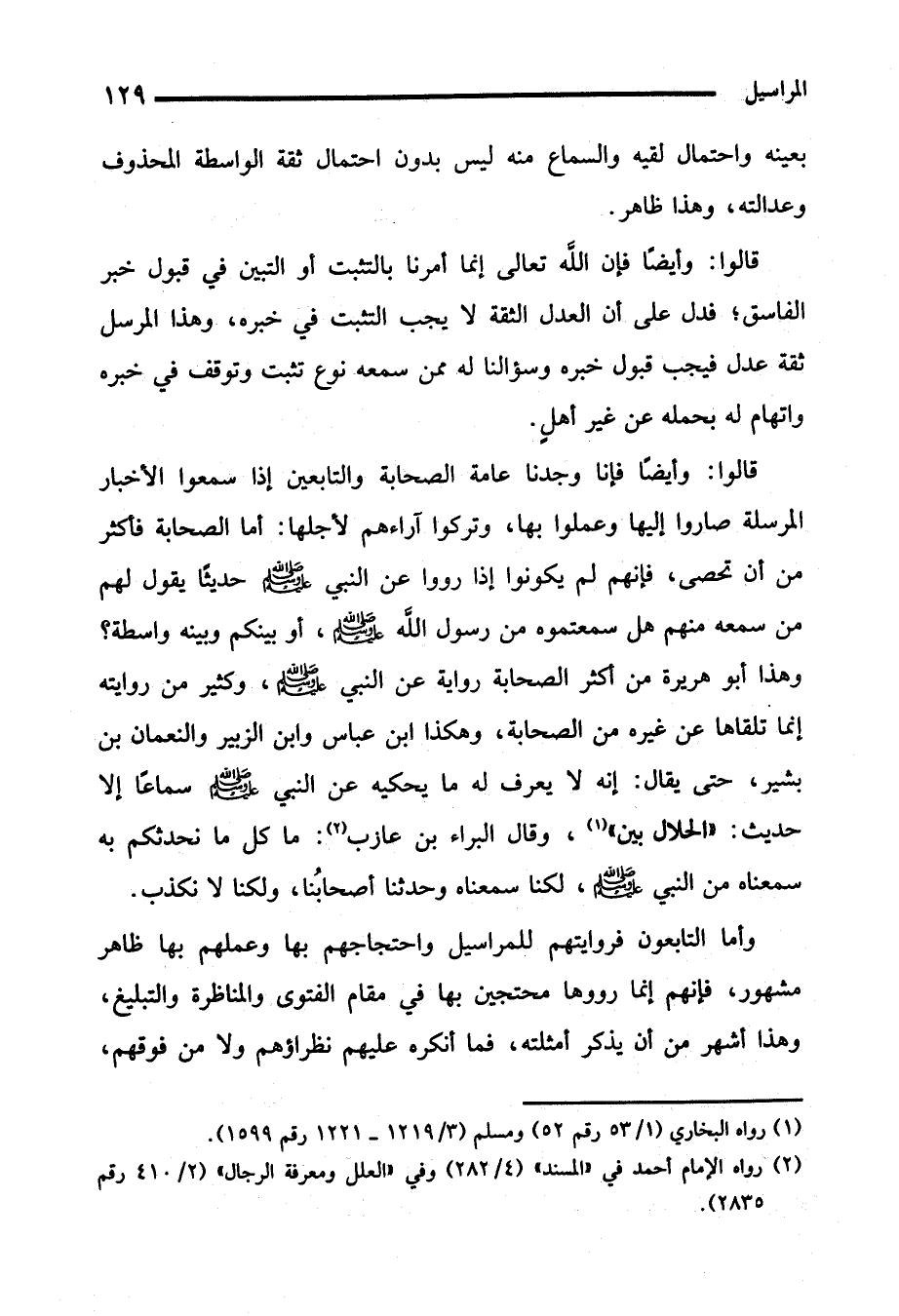 قالوا: وأيضًا فإنا وجدنا عامة الصحابة والتابعين إذا سمعوا الأخبار المرسلة صاروا إليها وعملوا بها، وتركوا آراءهم لأجلها: أما الصحابة فأكثر من أن تحصى، فإنهم لم يكونوا إذا رووا عن النبي - صلى الله عليه وسلم - حديثًا يقول لهم من سمعه منهم هل سمعتموه من رسول الله - صلى الله عليه وسلم -، أو بينكم وبينه واسطة؟ وهذا أبو هريرة من أكثر الصحابة رواية عن النبي - صلى الله عليه وسلم -، وكثير من روايته إنما تلقاها عن غيره من الصحابة، وهكذا ابن عباس وابن الزبير والنعمان بن بشير، حتى يقال: إنه لا يعرف له ما يحكيه عن النبي - صلى الله عليه وسلم - سماعًا إلا حديث: "الحلال بين" (¬1)، وقال البراء بن عازب (¬2): ما كل ما نحدثكم به سمعناه من النبي - صلى الله عليه وسلم -، لكنا سمعناه وحدثنا أصحابُنا, ولكنا لا نكذب.