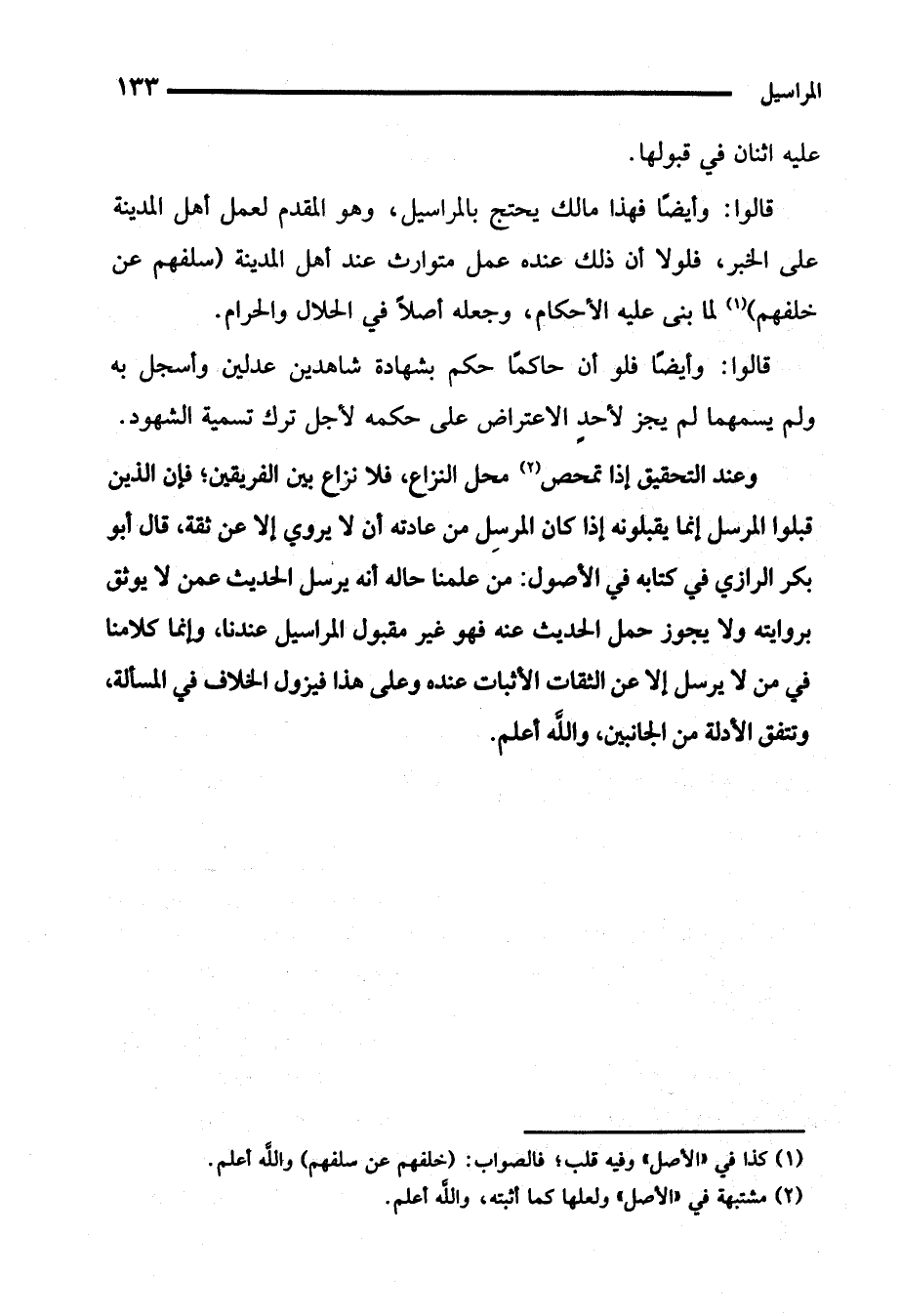قالوا: وأيضًا فهذا مالك يحتج بالمراسيل، وهو المقدم لعمل أهل المدينة على الخبر، فلولا أن ذلك عنده عمل متوارث عند أهل المدينة (سلفهم عن خلفهم) (¬1) لما بني عليه الأحكام، وجعله أصلًا في الحلال والحرام.