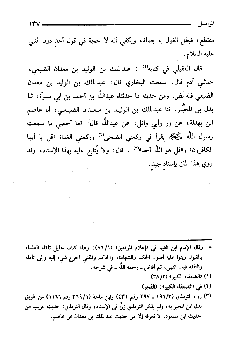 قال العقيلي في كتابه (¬1): عبد الملك بن الوليد بن معدان الضبعي، حدثني آدم قال: سمعت البخاري قال: عبد الملك بن الوليد بن معدان الضبعي فيه نظر. ومن حديثه ما حدثناه عبد الله بن أحمد بن أبي مسرّة، ثنا بدل بن المحُبَّر، ثنا عبد الملك بن الوليد بن معدان الضبعي، أنا عاصم ابن بهدلة، عن زر وأبي وائل، عن عبد الله قال: "ما أحصي ما سمعت رسول الله - صلى الله عليه وسلم - يقرأ في ركعتي الضحى (¬2) وركعتي الغداة {قُلْ يَاأَيُّهَا الْكَافِرُونَ} و {قُلْ هُوَ اللَّهُ أَحَدٌ} (¬3). قال: ولا يُتابع عليه بهذا الإسناد، وقد روي هذا المتن بإسنادٍ جيدٍ.