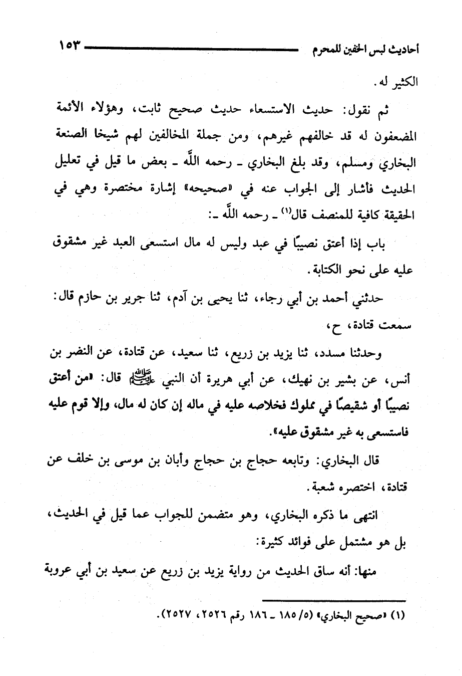 ثم نقول: حديث الاستسعاء حديث صحيح ثابت، وهؤلاء الأئمة المضعفون له قد خالفهم غيرهم، ومن جملة المخالفين لهم شيخًا الصنعة البخاري ومسلم، وقد بلغ البخاري -رحمه الله- بعض ما قيل في تعليل الحديث فأشار إلى الجواب عنه في "صحيحه" إشارة مختصرة وهي في الحقيقة كافية للمنصف قال (¬1) -رحمه الله-: