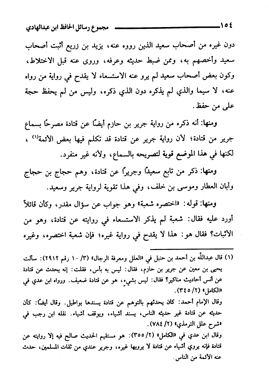وقال ابن عدي في "الكامل" (2/ 355): هو مستقيم الحديث صالح فيه إلا روايته عن قتادة فإنه يروي أشياء عن قتادة لا يرويها غيره، وجرير عندي من ثقات المسلمين، حدث عنه الأئمة من الناس.