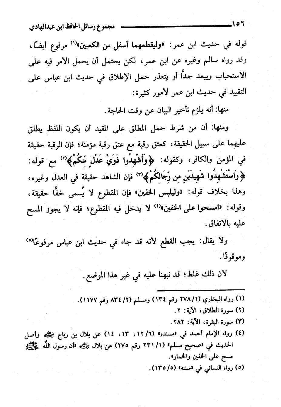 ومنها: أن من شرط حمل المطلق على المقيد أن يكون اللفظ يطلق عليهما على سبيل الحقيقة، كعتق رقبة مع عتق رقبة مؤمنة؛ فإن الرقبة حقيقة في المؤمن والكافر، وكقوله: {وَأَشْهِدُوا ذَوَيْ عَدْلٍ مِنْكُمْ} (¬2) مع قوله: {وَاسْتَشْهِدُوا شَهِيدَيْنِ مِنْ رِجَالِكُمْ} (¬3) فإن الشاهد حقيقة في العدل وغيره، وهذا بخلاف قوله: "وليلبس الخفين" فإن المقطوع لا يُسمى خفًّا حقيقة، وقوله: "امسحوا على الخفين" (¬4) لا يدخل فيه المقطوع؛ فإنه لا يجوز المسح عليه بالاتفاق.