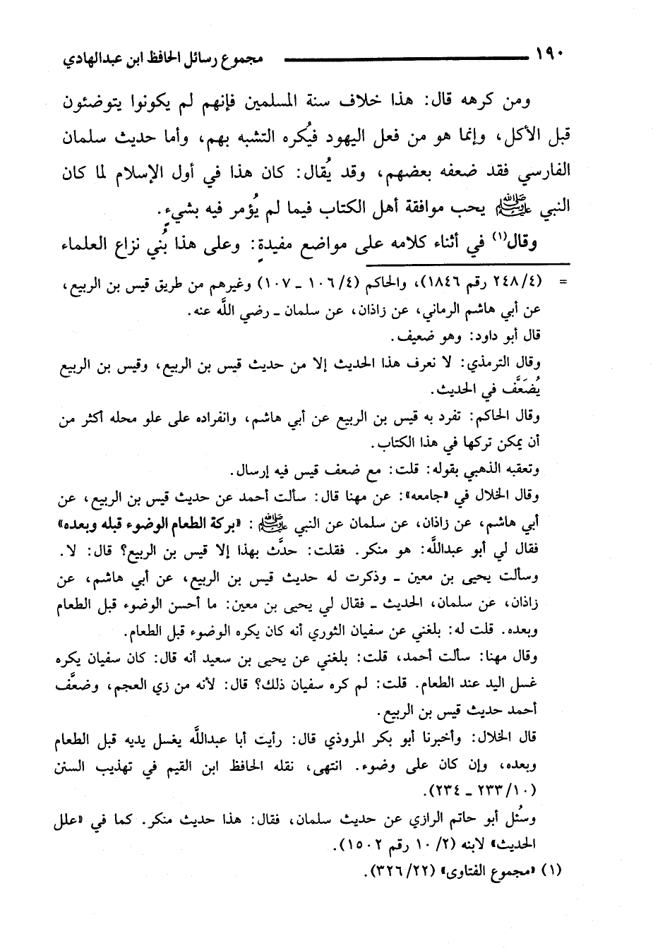 وقال الخلال في"جامعه": عن مهنا قال: سألت أحمد عن حديث قيس بن الربيع، عن أبي هاشم، عن زاذان، عن سلمان عن النبي - صلى الله عليه وسلم -: "بركة الطعام الوضوء قبله وبعده" فقال لي أبو عبد الله: هو منكر. فقلت: حدَّث بهذا إلا قيس بن الربيع؟ قال: لا. وسألت يحيى بن معين -وذكرت له حديث قيس بن الربيع، عن أبي هاشم، عن زاذان، عن سلمان، الحديث- فقال لي يحيى بن معين: ما أحسن الوضوء قبل الطعام وبعده. قلت له: بلغني عن سفيان الثوري أنه كات يكره الوضوء قبل الطعام.