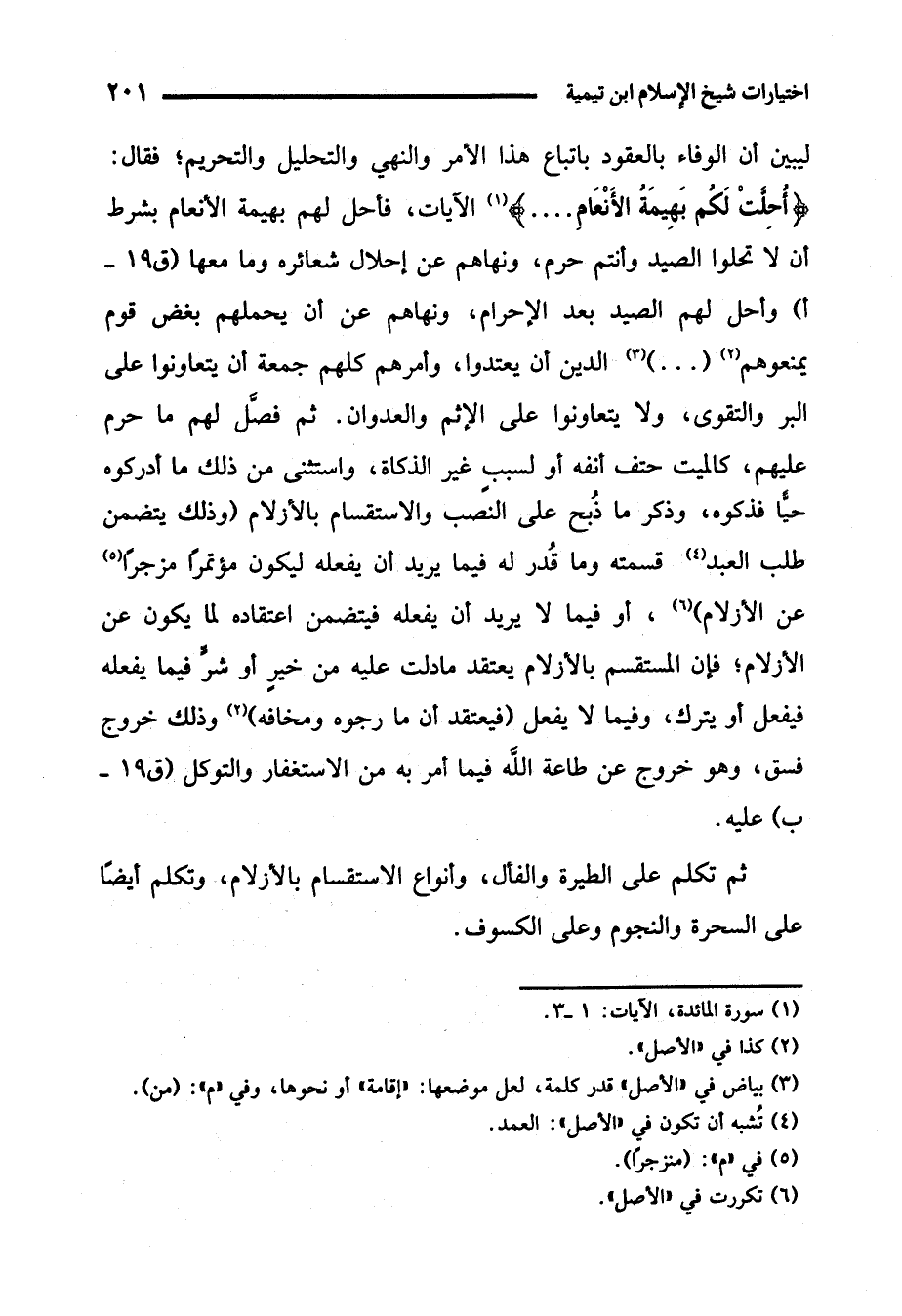 ليبين أن الوفاء بالعقود باتباع هذا الأمر والنهي والتحليل والتحريم؛ فقال: {أُحِلَّتْ لَكُمْ بَهِيمَةُ الْأَنْعَامِ .... } (¬1) الآيات، فأحل لهم بهيمة الأنعام بشرط أن لا تحلوا الصيد وأنتم حرم، ونهاهم عن إحلال شعائره وما معها (ق 19 - أ) وأحل لهم الصيد بعد الإحرام، ونهاهم عن أن يحملهم بغض قوم يمنعوهم (¬2) ( ... ) (¬3) الدين أن يعتدوا، وأمرهم كلهم جمعة أن يتعاونوا على البر والتقوى، ولا يتعاونوا على الإثم والعدوان. ثم فصَّل لهم ما حرم عليهم، كالميت حتف أنفه أو لسببٍ غير الذكاة، واستثنى من ذلك ما أدركوه حيًّا فذكره، وذكر ما ذُبح على النصب والاستقسام بالأزلام (وذلك يتضمن طلب العبد (¬4) قسمته وما قُدر له فيما يريد أن يفعله ليكون مؤتمرًا مزجرًا (¬5) عن الأزلام) (¬6)، أو فيما لا يريد أن يفعله فيتضمن اعتقاده لما يكون عن الأزلام؛ فإن المستقسم بالأزلام يعتقد ما دلت عليه من خيرٍ أو شرٍّ فيما يفعله فيفعل أو يترك، وفيما لا يفعل (فيعتقد أن ما رجوه ومخافه) (2) وذلك خروج فسق، وهو خروج عن طاعة الله فيما أمر به من الاستغفار والتوكل (ق 19 - ب) عليه.