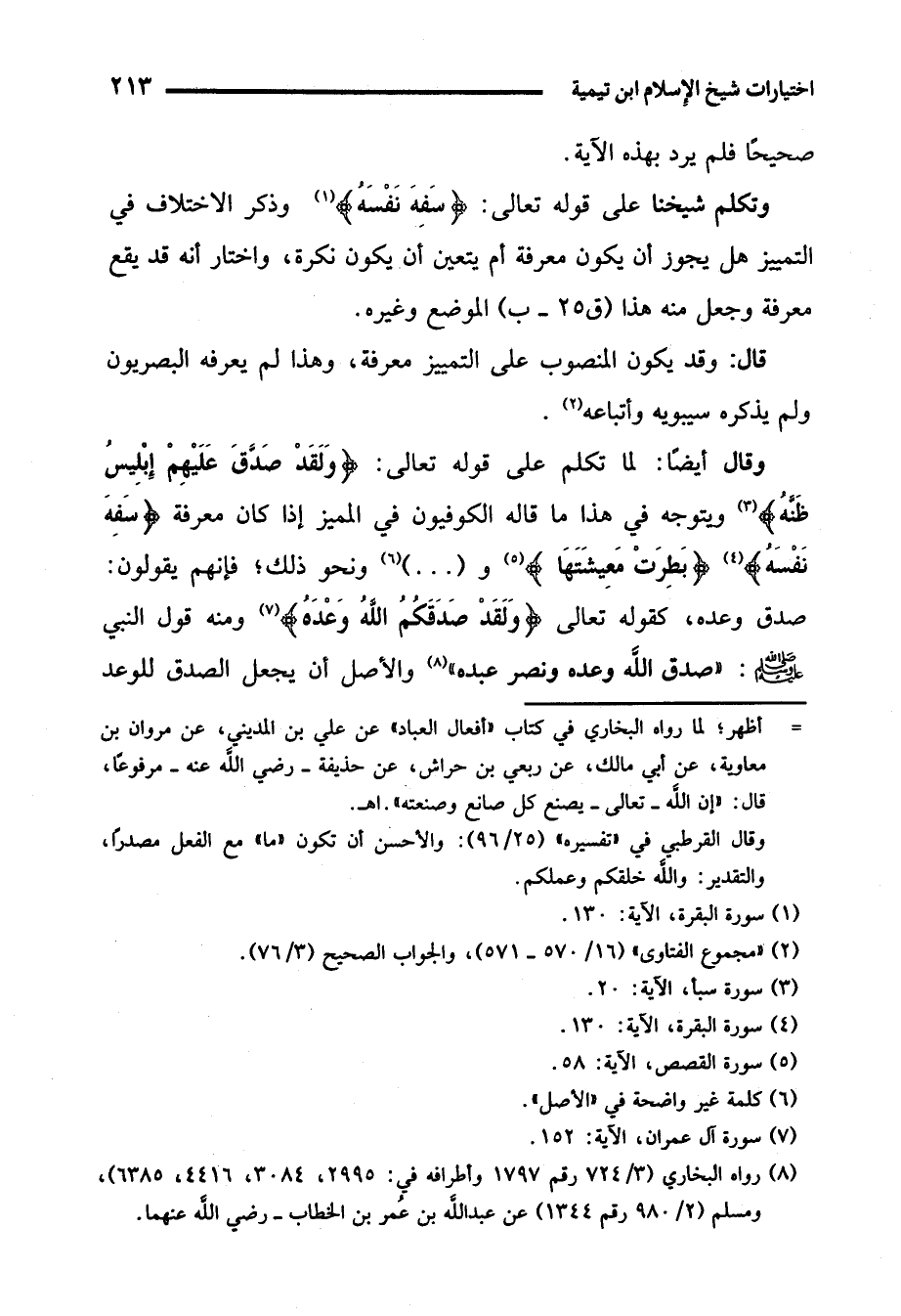وقال أيضاً: لما تكلم على قوله تعالى: {وَلَقَدْ صَدَّقَ عَلَيْهِمْ إِبْلِيسُ ظَنَّهُ} (¬3) ويتوجه في هذا ما قاله الكوفيون في المميز إذا كان معرفة {سَفِهَ نَفْسَهُ} (¬4) {بَطِرَتْ مَعِيشَتَهَا} (¬5) و ( ... ) (¬6) ونحو ذلك؛ فإنهم يقولون: صدق وعده، كقوله تعالى {وَلَقَدْ صَدَقَكُمُ اللَّهُ وَعْدَهُ} (¬7) ومنه قول النبي - صلى الله عليه وسلم -: "صدق الله وعده ونصر عبده" (¬8) والأصل أن يجعل الصدق للوعد