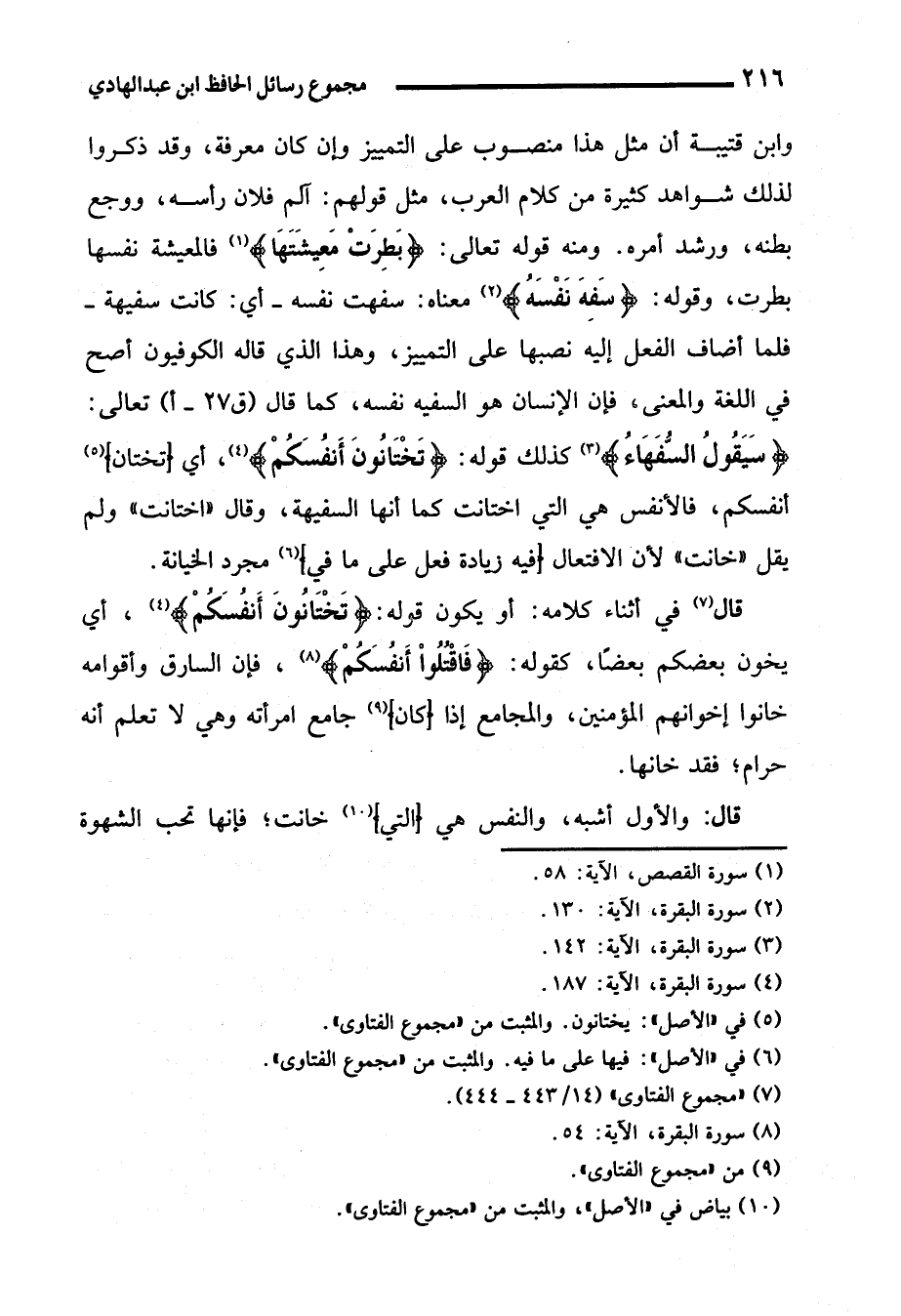 قال (¬7) في أثناء كلامه: أو يكون قوله: {تَخْتَانُونَ أَنفُسَكمْ} (4)؛ أي يخون بعضكم بعضًا، كقوله: {فَاقْتُلُوأ أَنفُسَكمْ} (¬8)، فإن السارق وأقوامه خانوا إخوانهم المؤمنين، والمجامع إذا {كان} (¬9) جامع امرأته وهي لا تعلم أنه حرام؛ فقد خانها.