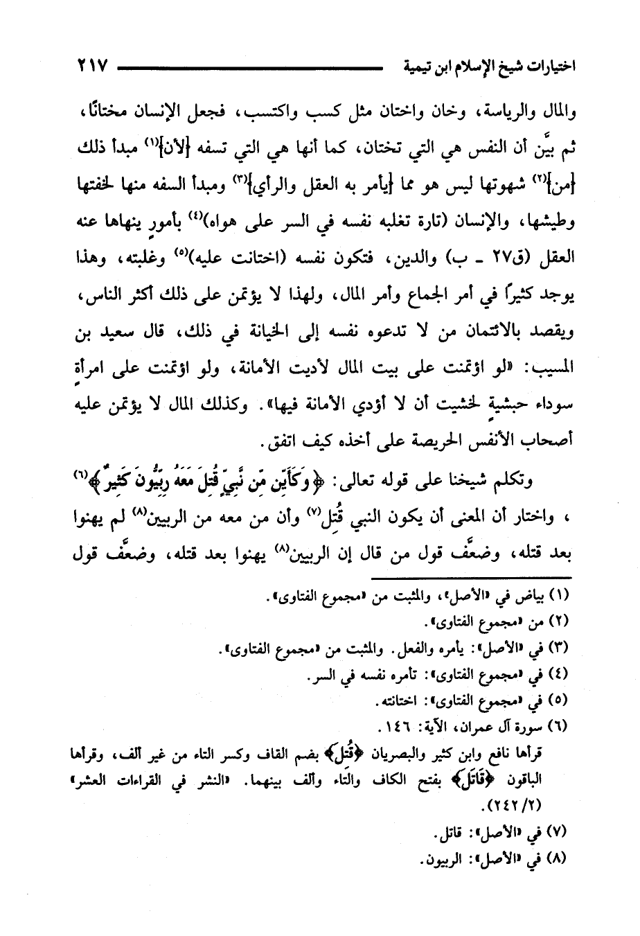وتكلم شيخنا على قوله تعالى: {وَكَأَيِّنْ مِنْ نَبِيٍّ قَاتَلَ مَعَهُ رِبِّيُّونَ كَثِيرٌ} (¬6)، واختار أن المعنى أن يكون النبي قُتِل (¬7) وأن من معه من الربيين (8) لم يهنوا بعد قتله، وضعَّف قول من قال إن الربيين (¬8) يهنوا بعد قتله، وضعَّف قول