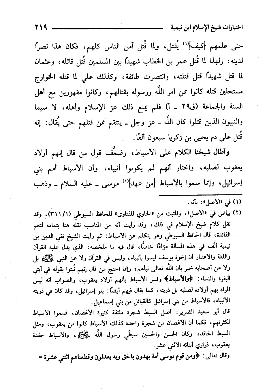 (¬2) بياض في "الأصل"، والمثبت من "الحاوي للفتاوى" للحافظ السيوطي (1/ 311)، وقد نقل كلام شيخ الإسلام في ذلك، وقد رأيت أنه من المناسب نقله هنا بتمامه لتعم الفائدة، قال الحافظ السيوطي وهو يتكلم عن الأسباط: ثم رأيت الشيخ تقي الدين بن تيمية ألَّف في هذه المسألة مؤلفاً خاصًّا، قال فيه ما ملخصه: الذي يدل عليه القرآن واللغة والاعتبار أن إخوة يوسف ليسوا بأنبياء، وليس في القرآن ولا عن النبي - صلى الله عليه وسلم - بل ولا من أصحابه خبر بأن الله تعالى نبأهم، وإنما احتج من قال إنهم نُبئوا بقوله في آيتي البقرة والنساء: {وَالْأَسْبَاطِ} وفسر الأسباط بأنهم أولاد يعقوب، والصواب أنه ليس المراد بهم أولاده لصلبه بل ذريته، كما يقال فيهم أيضاً: بنو إسرائيل، وقد كان في ذريته الأنبياء، فالأسباط من بني إسرائيل كالقبائل من بني إسماعيل.
