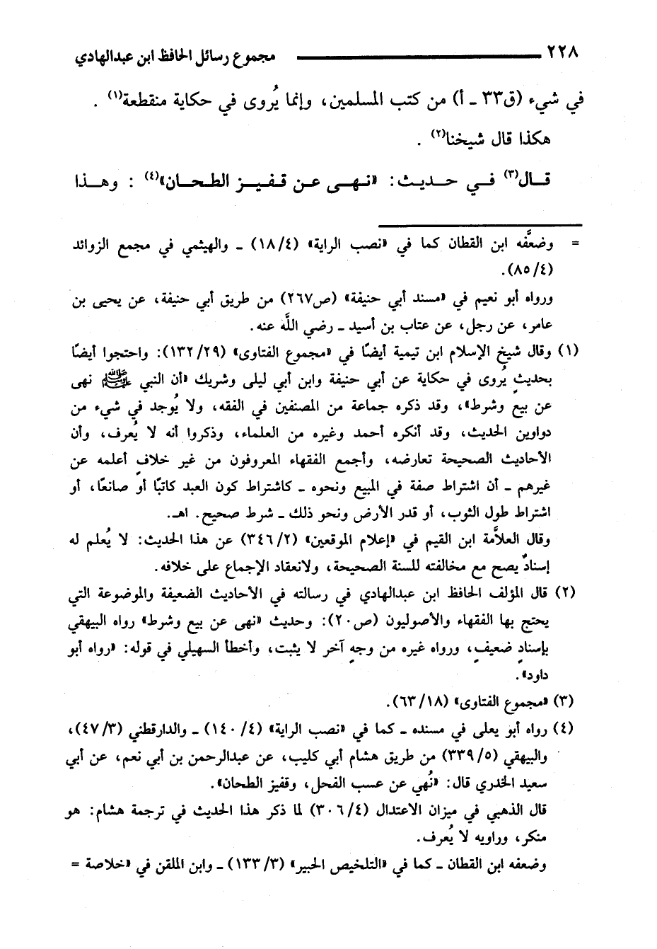 (¬2) قال المؤلف الحافظ ابن عبد الهادي في رسالته في الأحاديث الضعيفة والموضوعة التي يحتج بها الفقهاء والأصوليون (ص 20): وحديث "نهى عن بيع وشرط" رواه البيهقي بإسنادٍ ضعيفٍ، ورواه غيره من وجهٍ آخر لا يثبت، وأخطأ السهيلي في قوله: "رواه أبو داود".