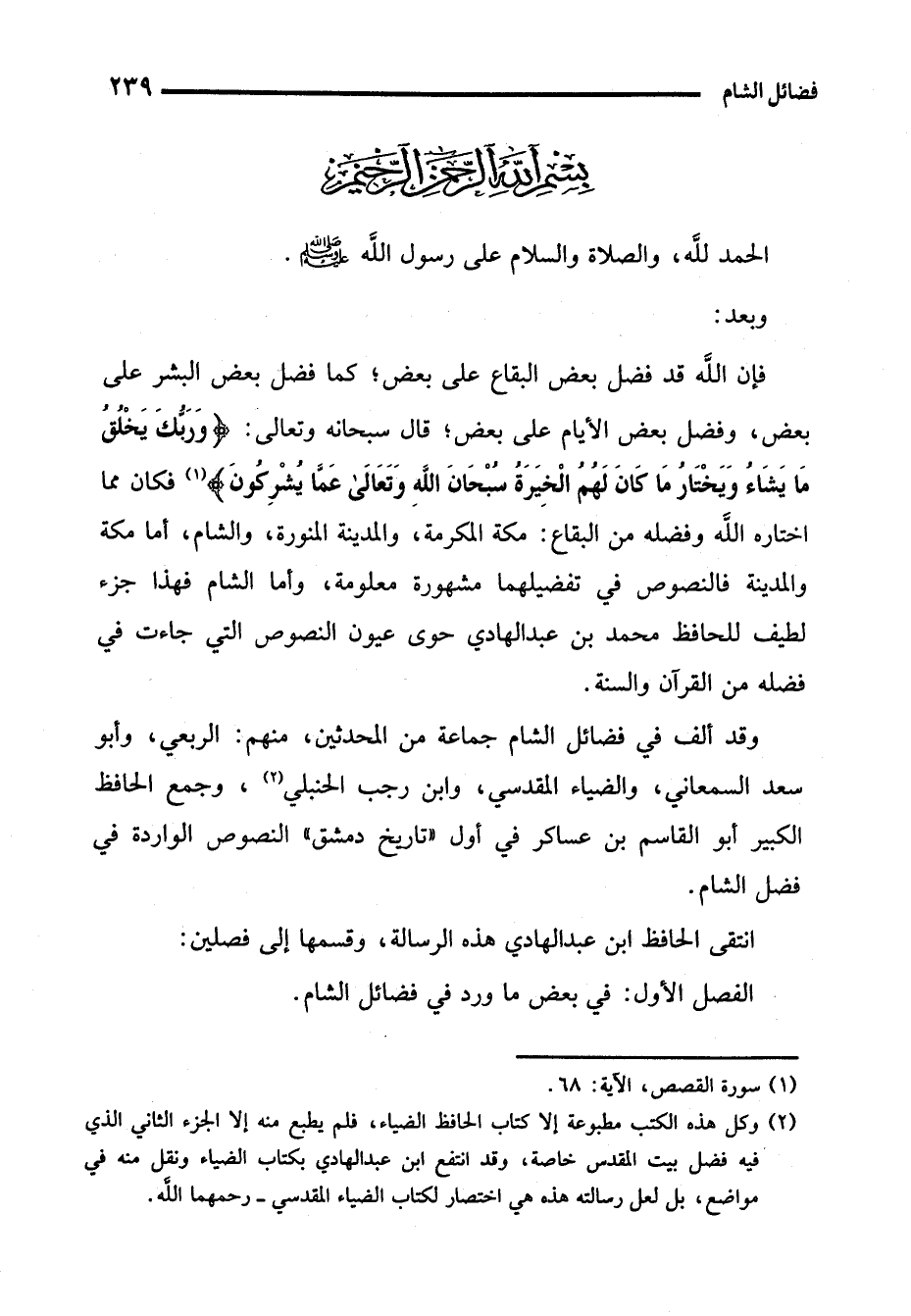 فإن الله قد فضل بعض البقاع على بعض؛ كما فضل بعض البشر على بعض، وفضل بعض الأيام على بعض؛ قال سبحانه وتعالى: {وَرَبُّكَ يَخْلُقُ مَا يَشَاءُ وَيَخْتَارُ مَا كَانَ لَهُمُ الْخِيَرَةُ سُبْحَانَ اللَّهِ وَتَعَالَى عَمَّا يُشْرِكُونَ} (¬1) فكان مما اختاره الله وفضله من البقاع: مكة المكرمة، والمدينة المنورة، والشام، أما مكة والمدينة فالنصوص في تفضيلهما مشهورة معلومة، وأما الشام فهذا جزء لطيف للحافظ محمد بن عبد الهادي حوى عيون النصوص التي جاءت في فضله من القرآن والسنة.