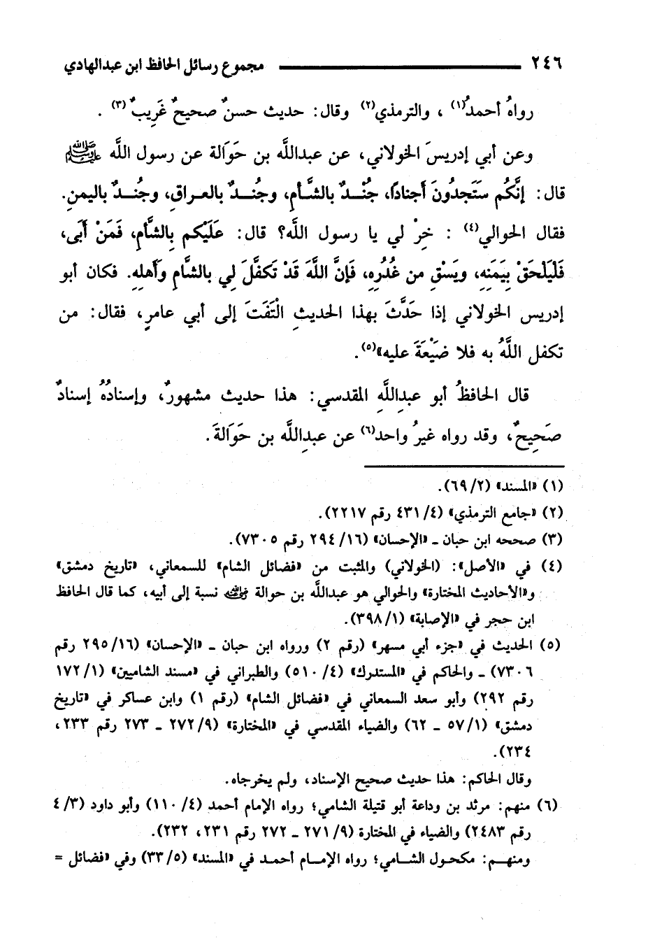 قال الحافظُ أبو عبدِ اللهِ المقدسي: هذا حديث مشهورٌ، وإسنادُهُ إسنادٌ صَحِيحٌ، وقد رواه غيرُ واحد (¬6) عن عبدِ الله بن حَوَالةَ.
