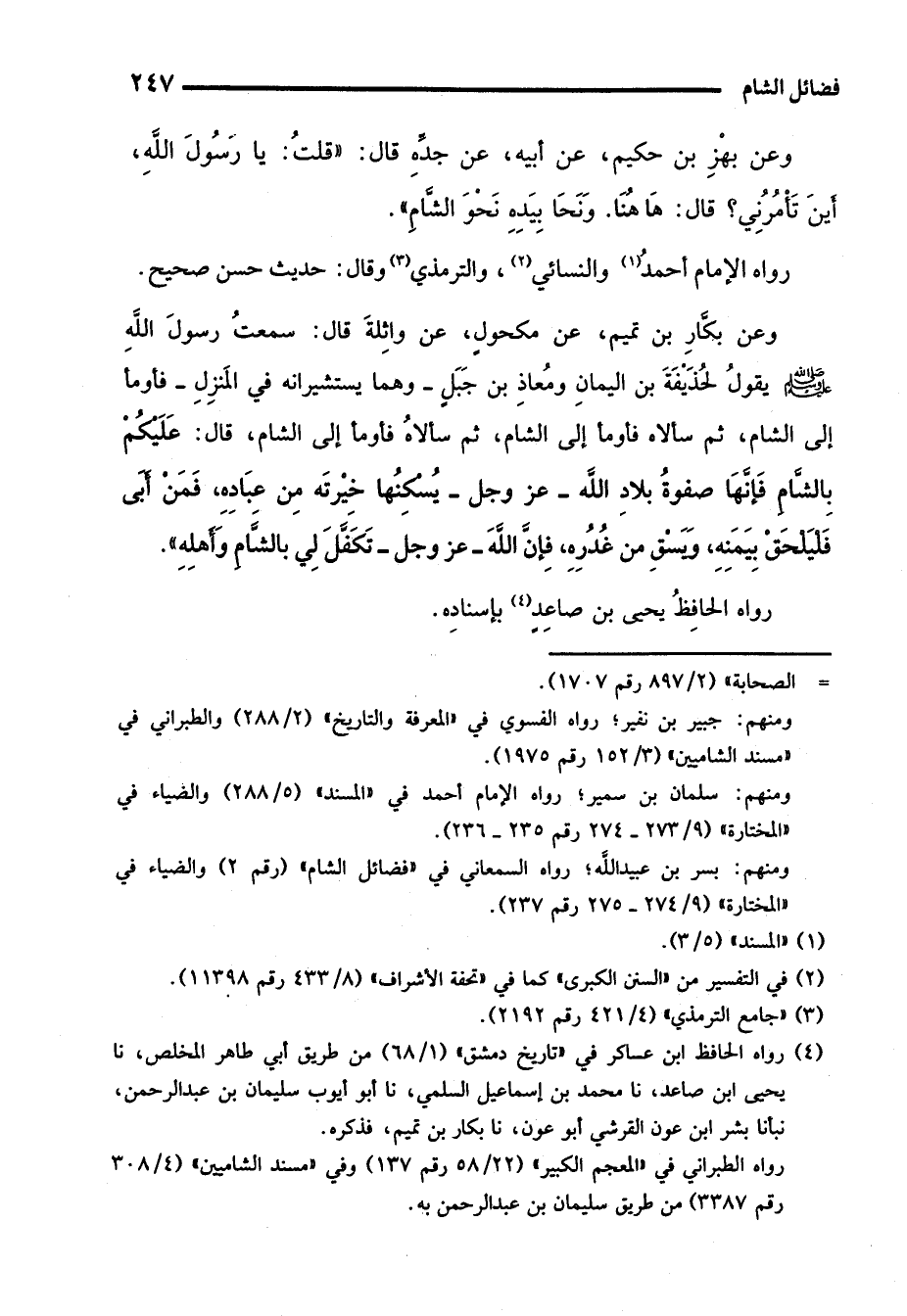 وعن بهْزِ بن حكيم، عن أبيه، عن جدِّهِ قال: "قلتُ: يا رسُولَ اللهِ، أينَ تَأمُرُنِي؟ قال: هَا هُنَا. وَنَحَا بِيَدِهِ نَحْوَ الشَّامِ".