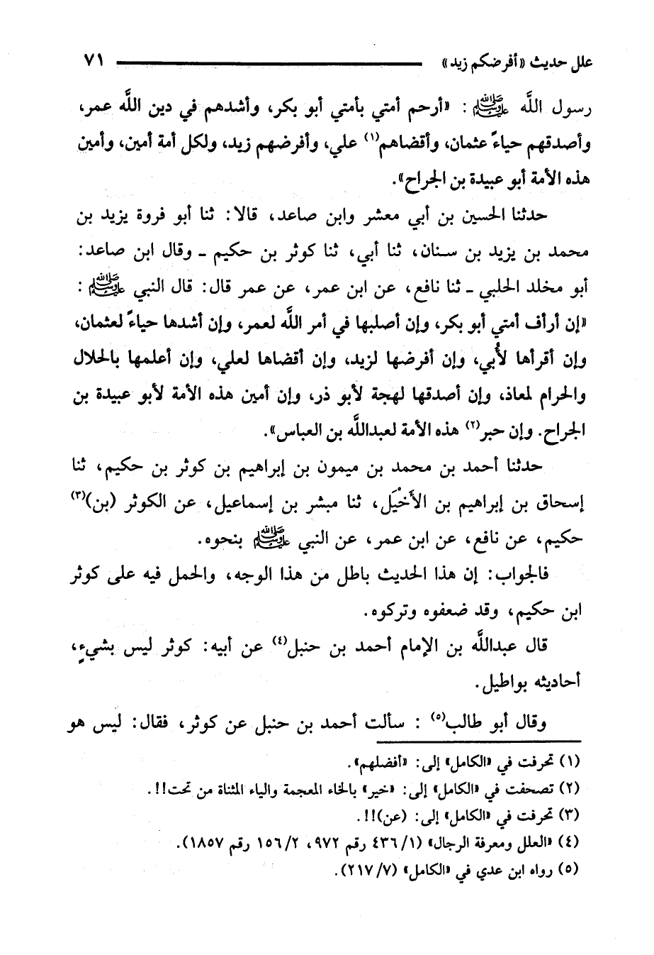 حدثنا الحسين بن أبي معشر وابن صاعد، قال: ثنا أبو فروة يزيد بن محمد بن يزيد بن سنان، ثنا أبي، ثنا كوثر بن حكيم -وقال ابن صاعد: أبو مخلد الحلبي- ثنا نافع، عن ابن عمر، عن عمر قال: قال النبي - صلى الله عليه وسلم -: "إن أرأف أمتي أبو بكر، وإن أصلبها في أمر الله لعمر، وإن أشدها حياءً لعثمان، كان أقرأها لأُبي، كان أفرضها لزيد، وإن أقضاها لعلي، وإن أعلمها بالحلال والحرام لمعاذ، وإن أصدقها لهجة لأبو ذر، وإن أمين هذه الأمة لأبو عبيدة بن الجراح. وإن حبر (¬2) هذه الأمة لعبد الله بن العباس".