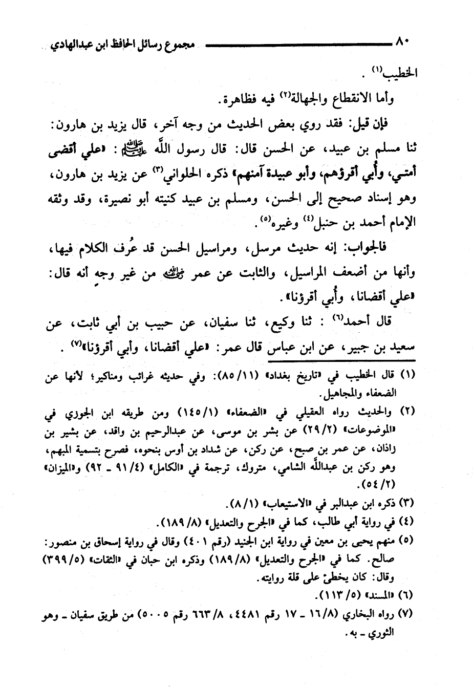 فإن قيل: فقد روي بعض الحديث من وجه آخر، قال يزيد بن هارون: ثنا مسلم بن عبيد، عن الحسن قال: قال رسول الله - صلى الله عليه وسلم -: "علي أقضى أمتي، وأُبي أقرؤهم، وأبو عبيدة آمنهم" ذكره الحلواني (¬3) عن يزيد بن هارون، وهو إسناد صحيح إلى الحسن، ومسلم بن عبيد كنيته أبو نصيرة، وقد وثقه الإمام أحمد بن حنبل (¬4) وغيره (¬5).