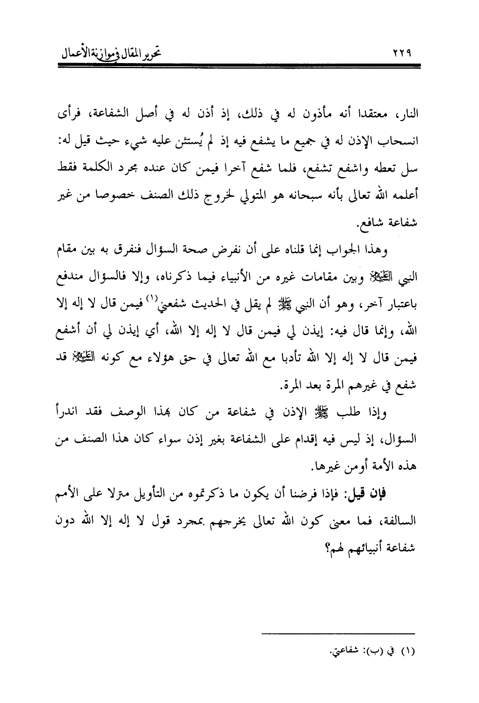 فإن قيل: فإذا فرضنا أن يكون ما ذكرتموه من التأويل منزلا على الأمم السالفة، فما معنى كون الله تعالى يخرجهم بمجرد قول لا إله إلا الله دون شفاعة أنبيائهم لهم؟